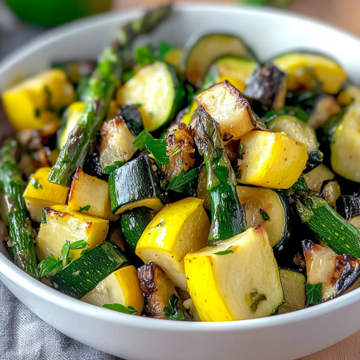 Vibrant Colors and Textures: This dish offers a stunning medley of colors and a delightful mix of crisp asparagus, tender zucchini, and sweet yellow squash.