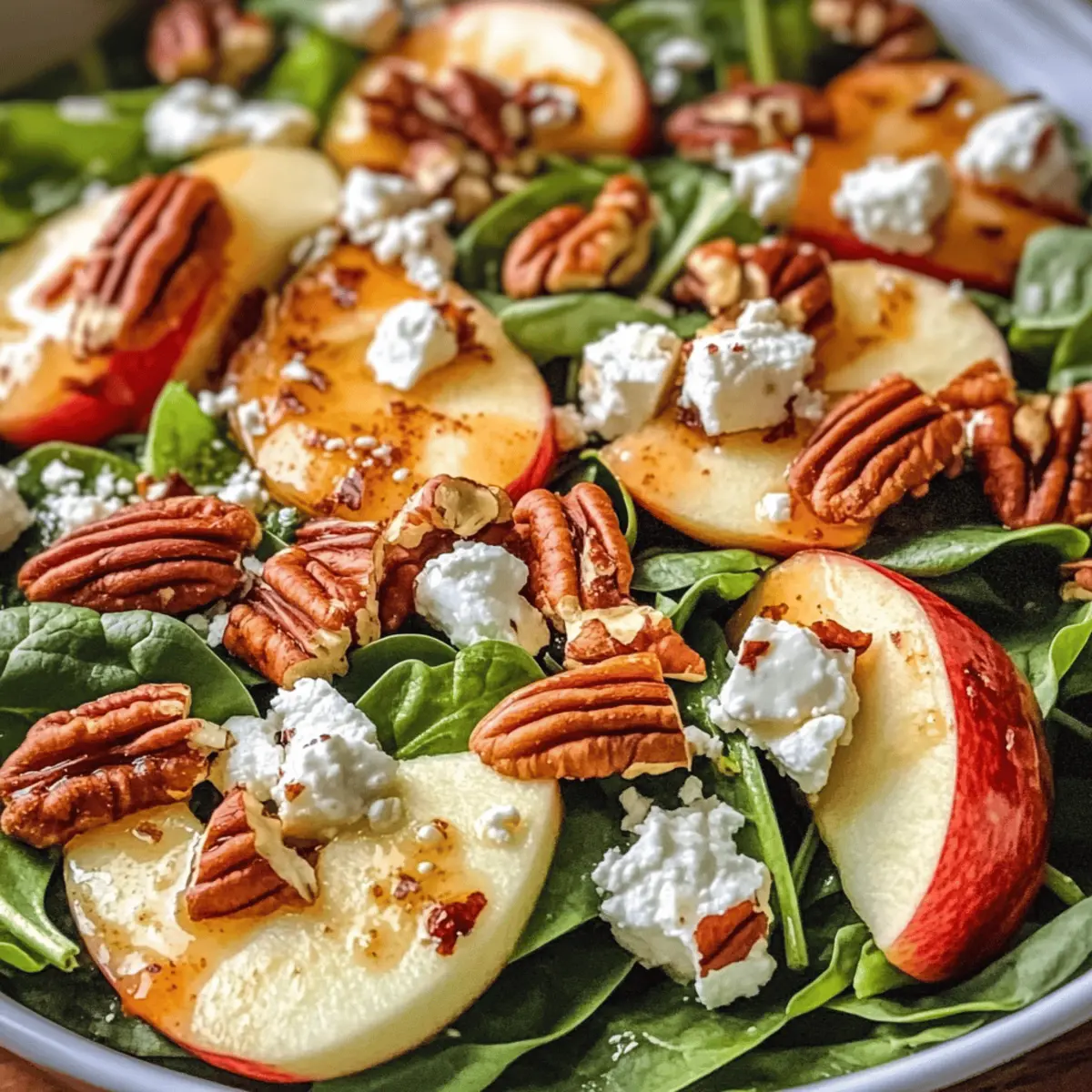 - In a large mixing bowl, combine apples, feta, soaked red onion, pecans, and spinach. Gently toss to mix.