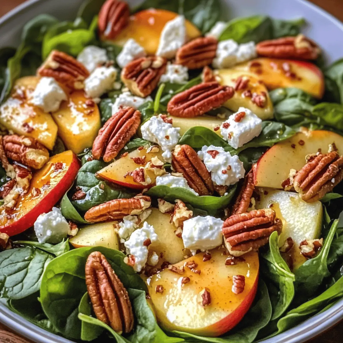 In a large mixing bowl, combine your sliced Honeycrisp apples, crumbled feta cheese, soaked red onion, toasted pecans, and fresh spinach. Gently toss the ingredients together with clean hands or salad tongs, ensuring even distribution of flavors without bruising the apples. This vibrant mix will form the base of your Autumn Harvest Honeycrisp Apple and Feta Salad, ready for dressing.