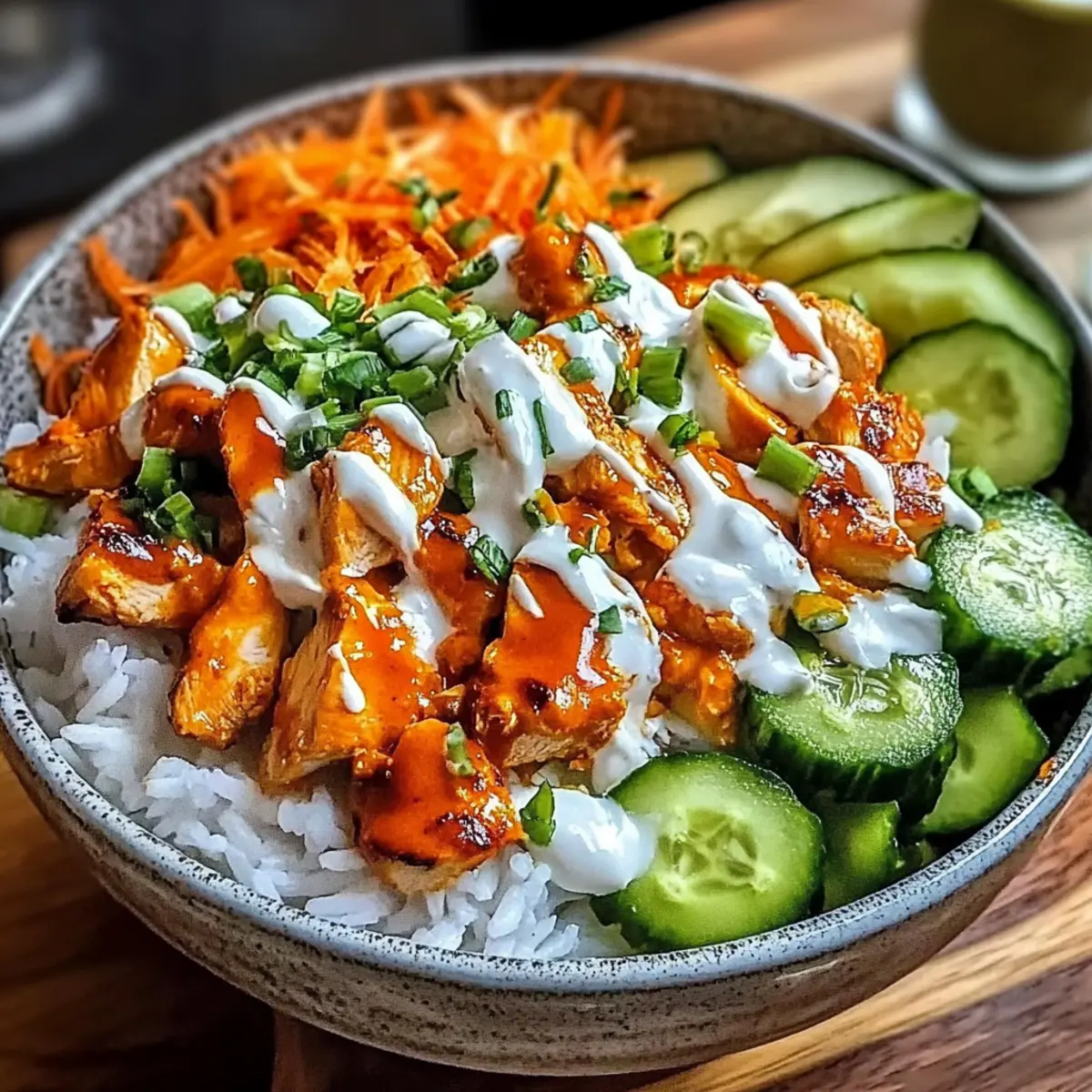 Nutty Quinoa: Use quinoa instead of rice for added protein and a nuttier flavor. Quinoa’s fluffy texture is a perfect match for the spicy buffalo chicken, giving your bowl more depth.