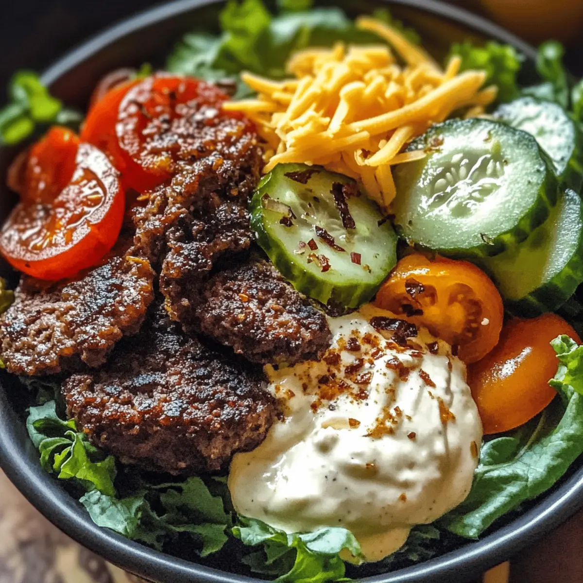 Using deep bowls, start with a generous layer of crispy lettuce as your base. Top with a hearty scoop of the cooked beef, then layer on the diced tomatoes, cucumbers, and red onion. Drizzle your creamy caramelized onion aioli generously over the top, sprinkle shredded cheddar cheese, and finish with fresh chives for a burst of flavor in your Burger Bowls. Serve immediately with extra aioli on the side.