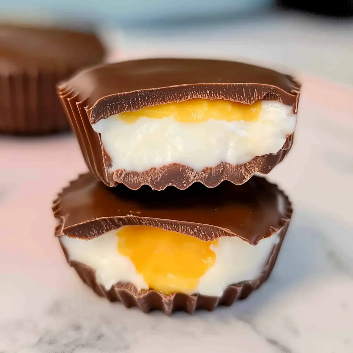 - Re-melt remaining milk chocolate and pipe or spoon it over the filling in each cup, sealing completely.