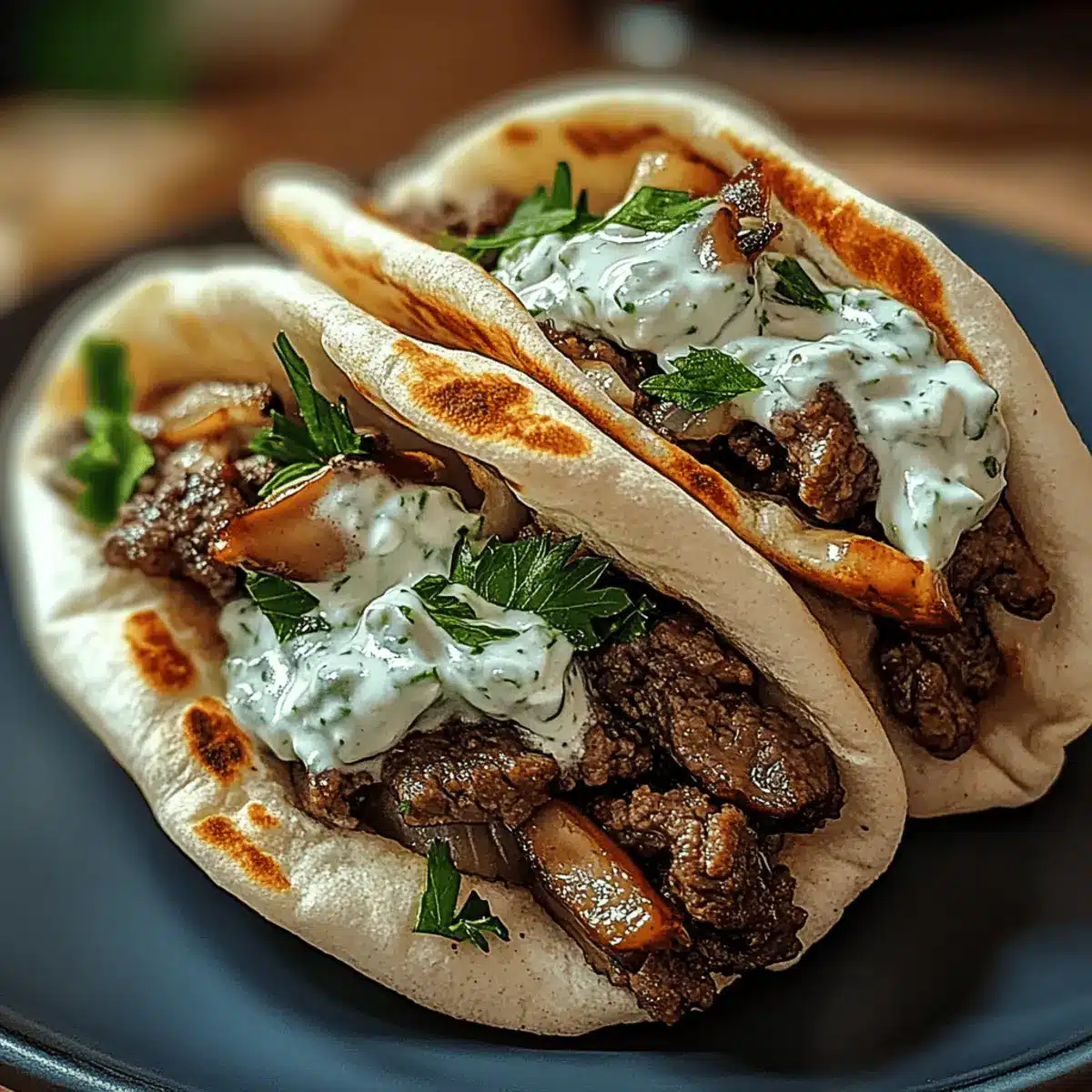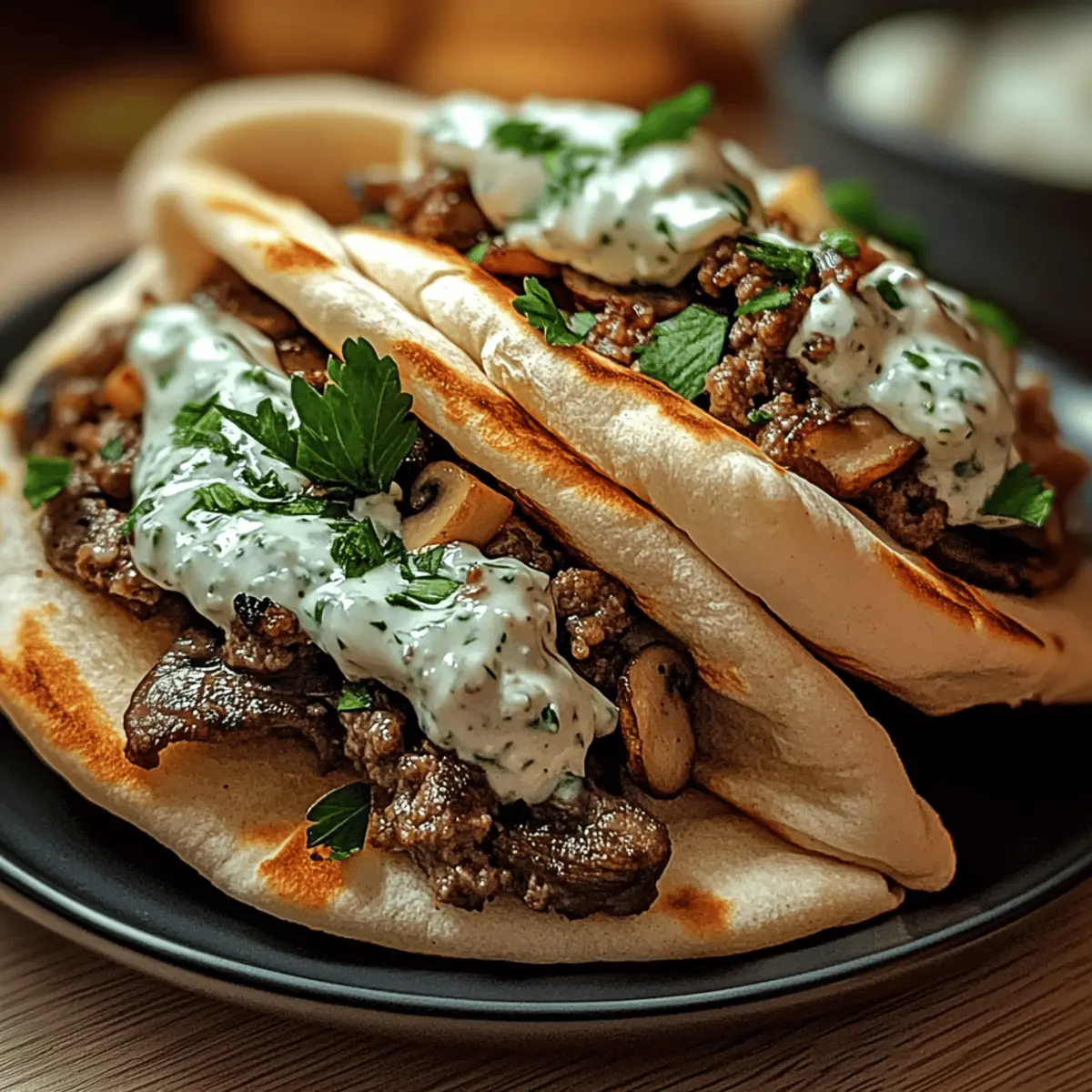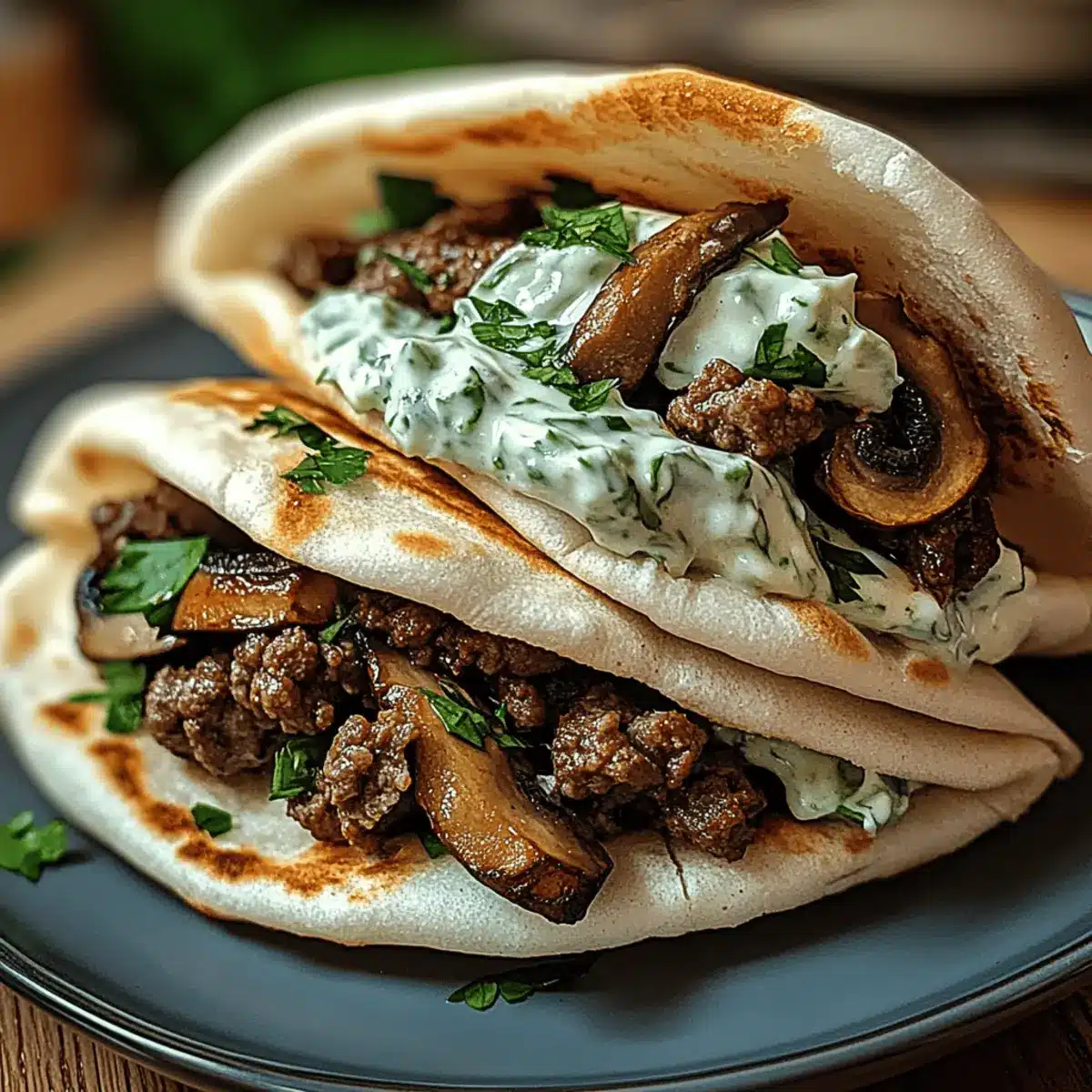 Cheesy Beef and Mushroom Pita Pockets with Tzatziki Sauce Bliss