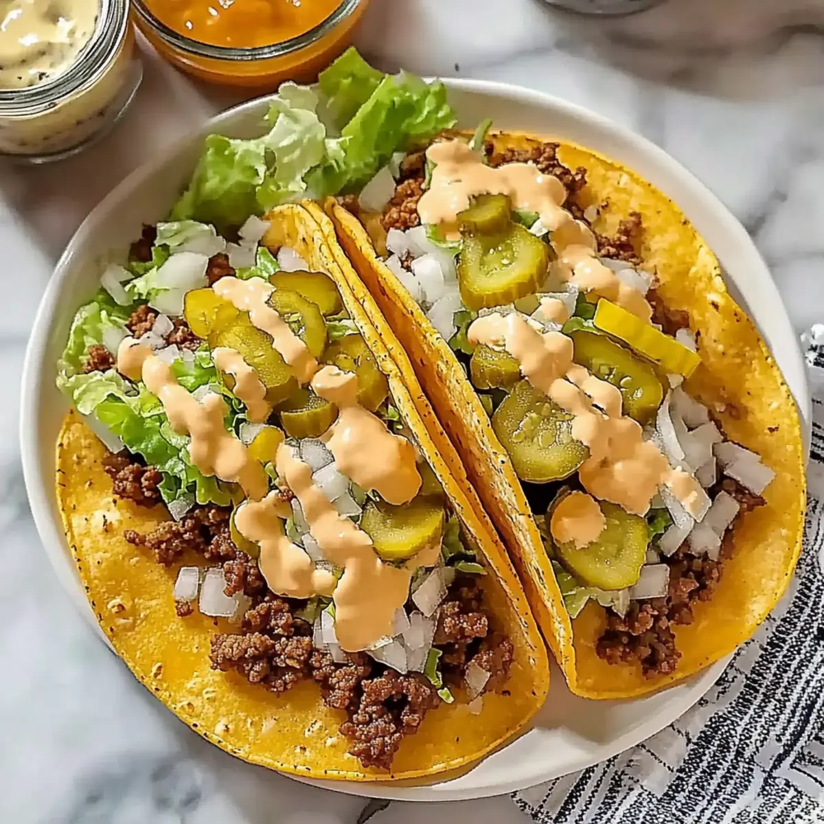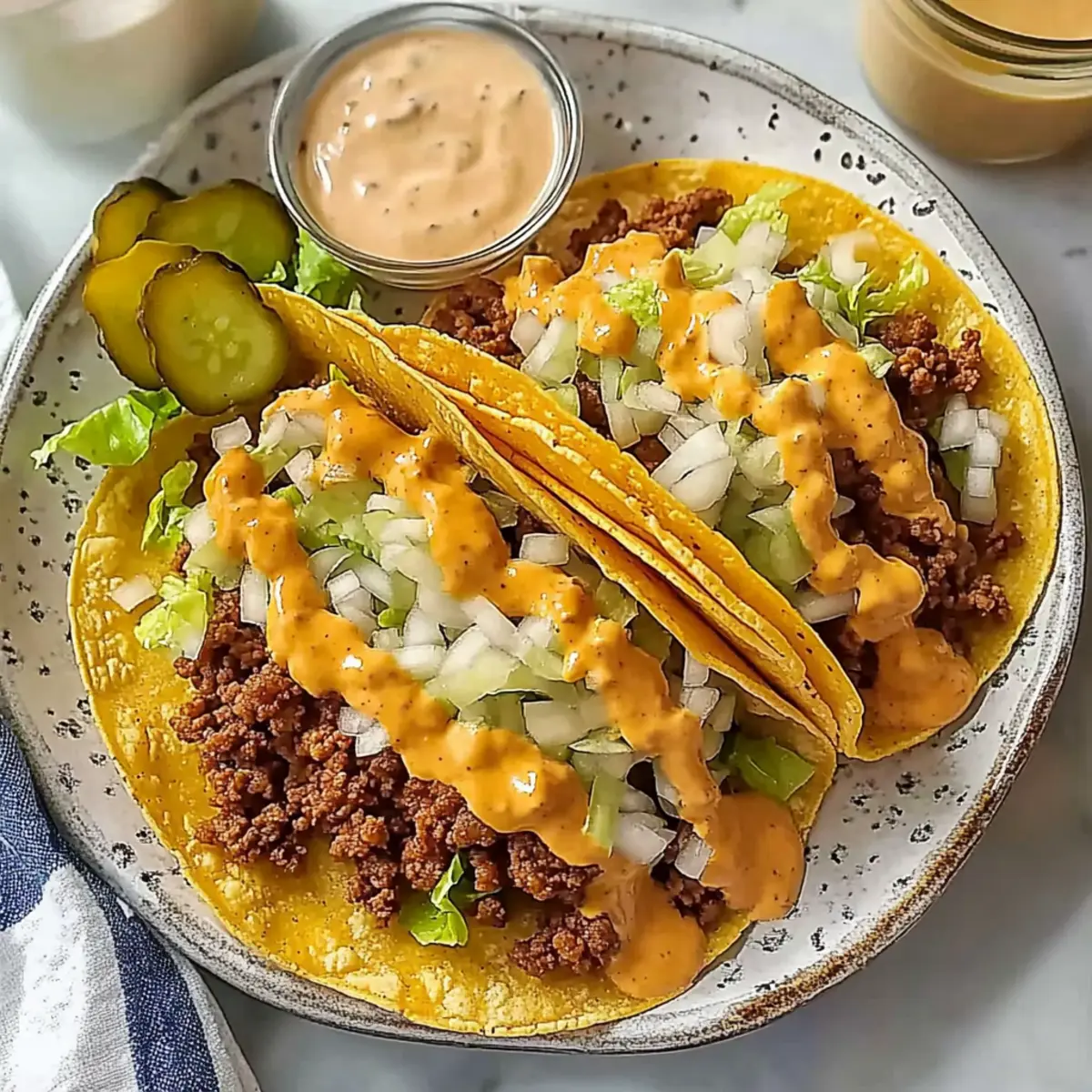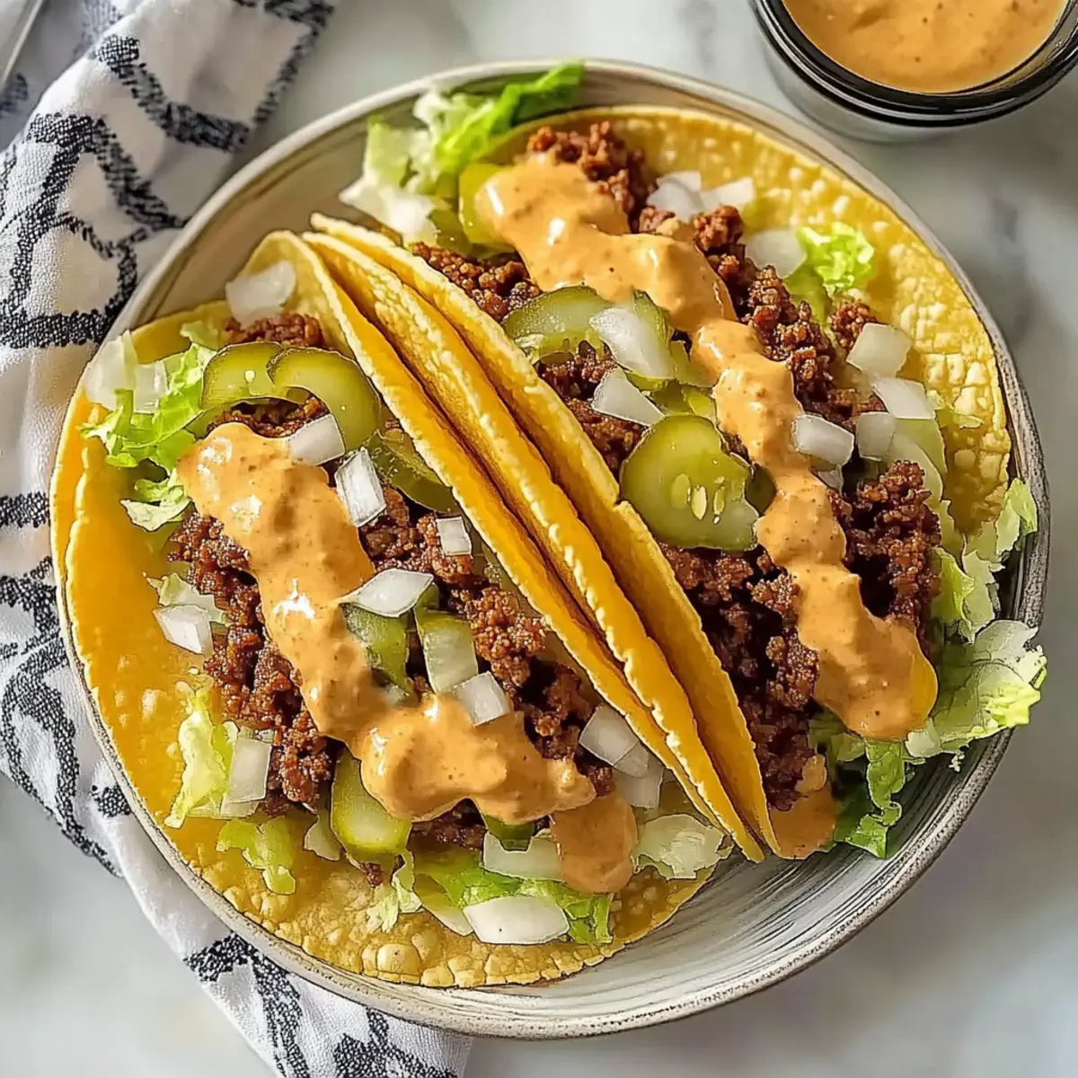 - Assemble Tacos: Place the cheesy beef on the tortilla, add burger sauce, lettuce, onion, and pickles.
