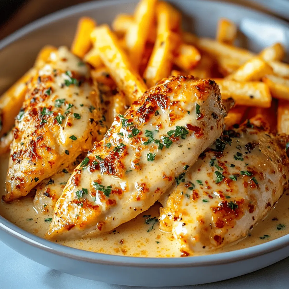 Now for the exciting part! Serve your delicious Chicken Fillet in Spicy, Creamy Garlic-Parmesan Sauce immediately alongside those crispy fries. For an extra burst of freshness, garnish the dish with finely chopped parsley. Dive into this comforting meal and enjoy every delicious bite!