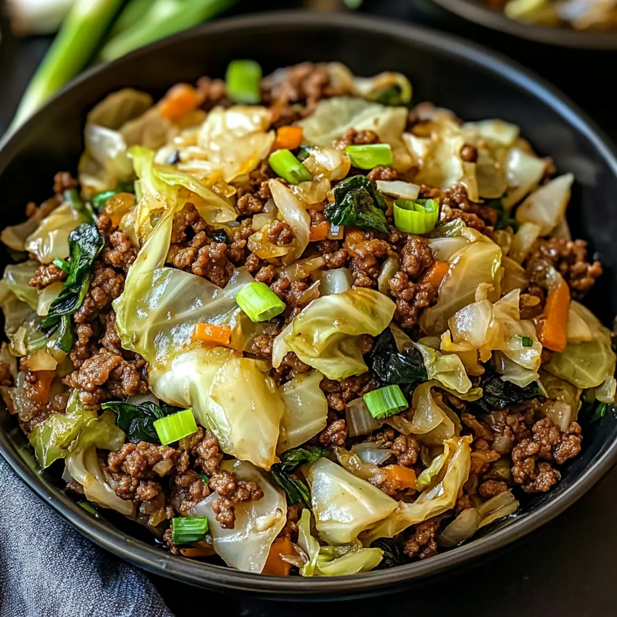 Right before serving, fold in the green onions for a fresh pop of flavor. Remove the skillet from heat and let it rest for a minute. This final touch adds brightness to your dish, making it visually appealing and aromatic. Your meal now reflects the delightful fusion of savory beef and tender cabbage.