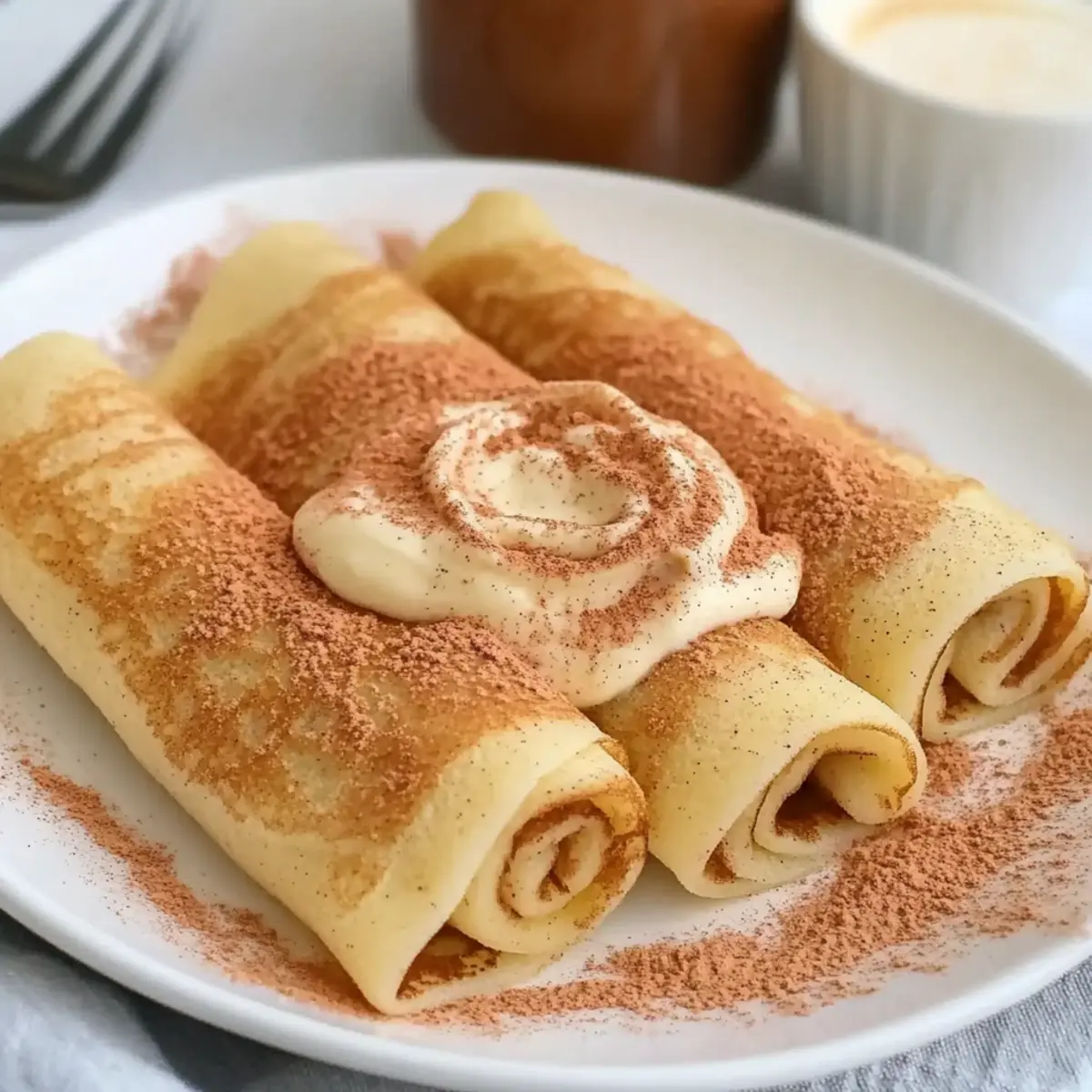 - Remove each crepe carefully and spread a layer of the cinnamon yogurt filling on one side. Roll it up tightly and place seam-side down.