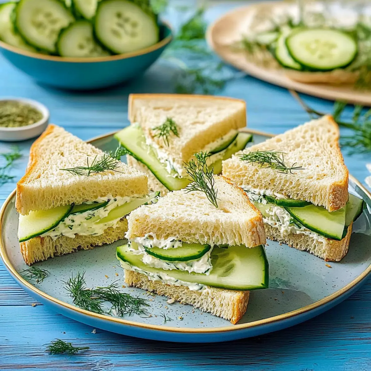 - Transfer the cut sandwiches onto a serving dish, and optionally garnish with extra sprigs of dill or cucumber slices.
