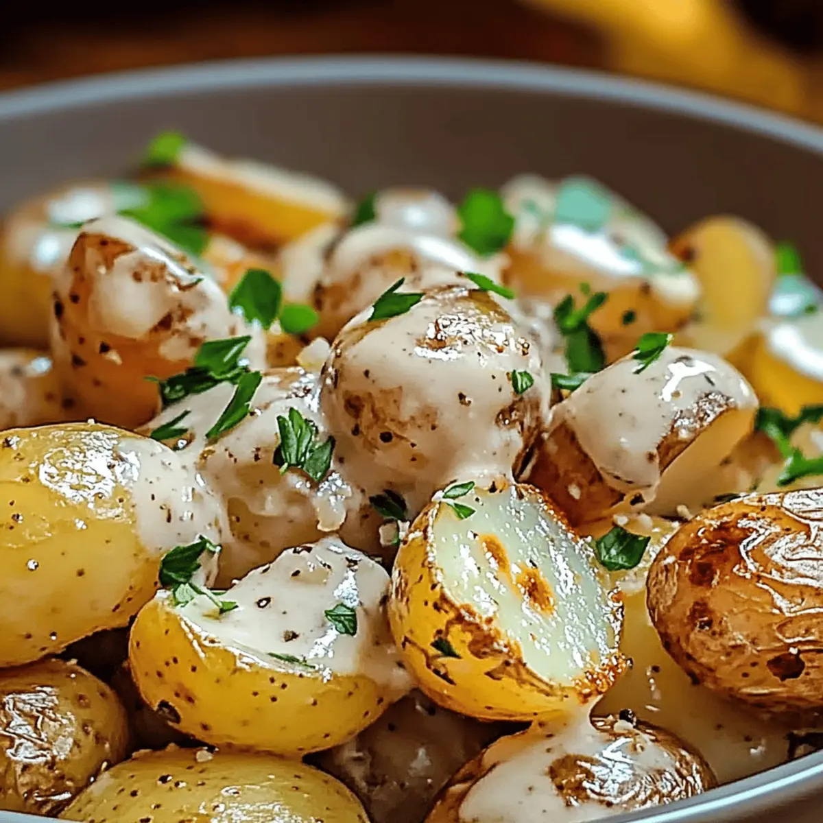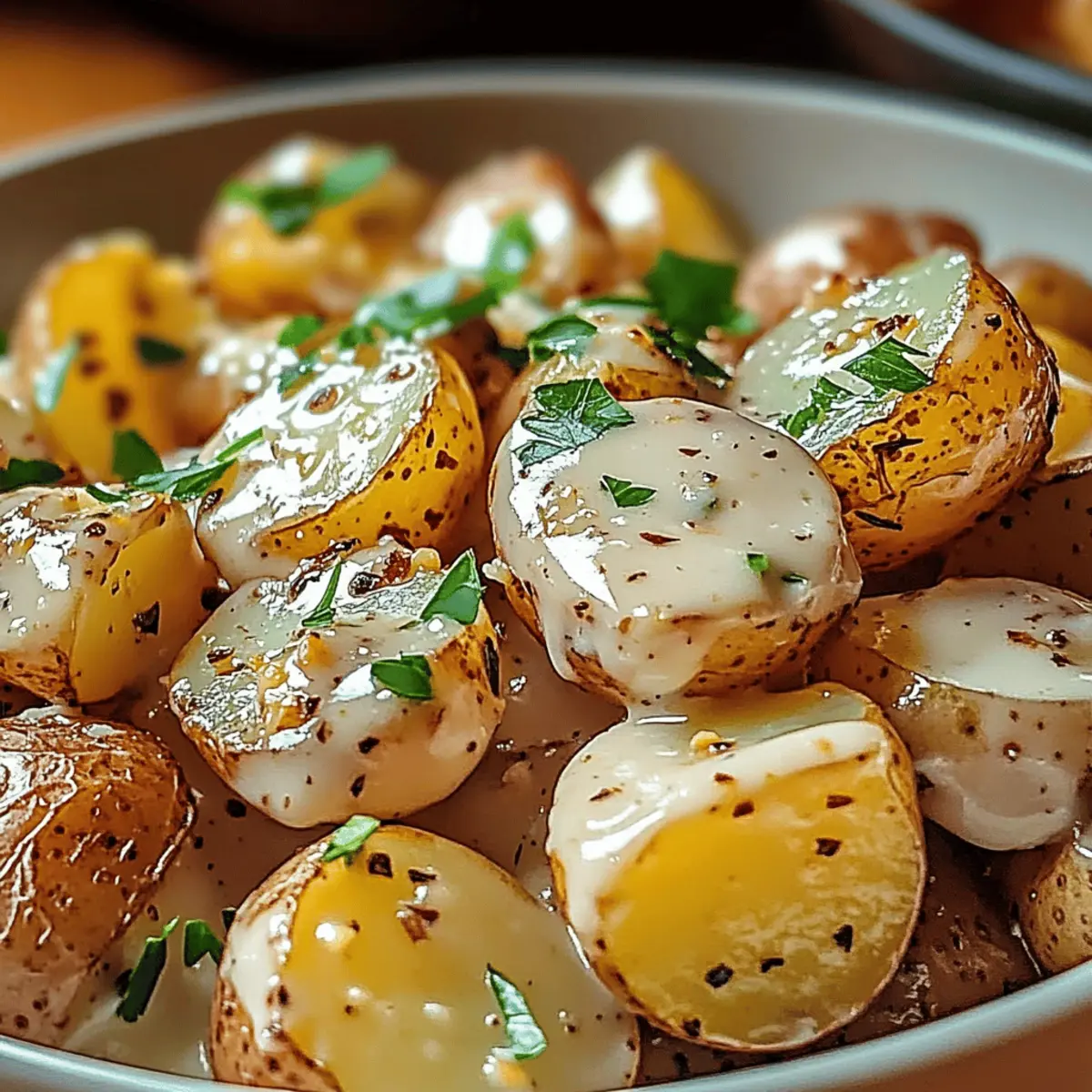 When the baby potatoes are perfectly roasted, remove them from the oven and pour the creamy garlic sauce over them directly on the baking sheet. Toss everything gently so the sauce coats each potato. Finish by garnishing with freshly chopped parsley for a pop of color and a hint of freshness.