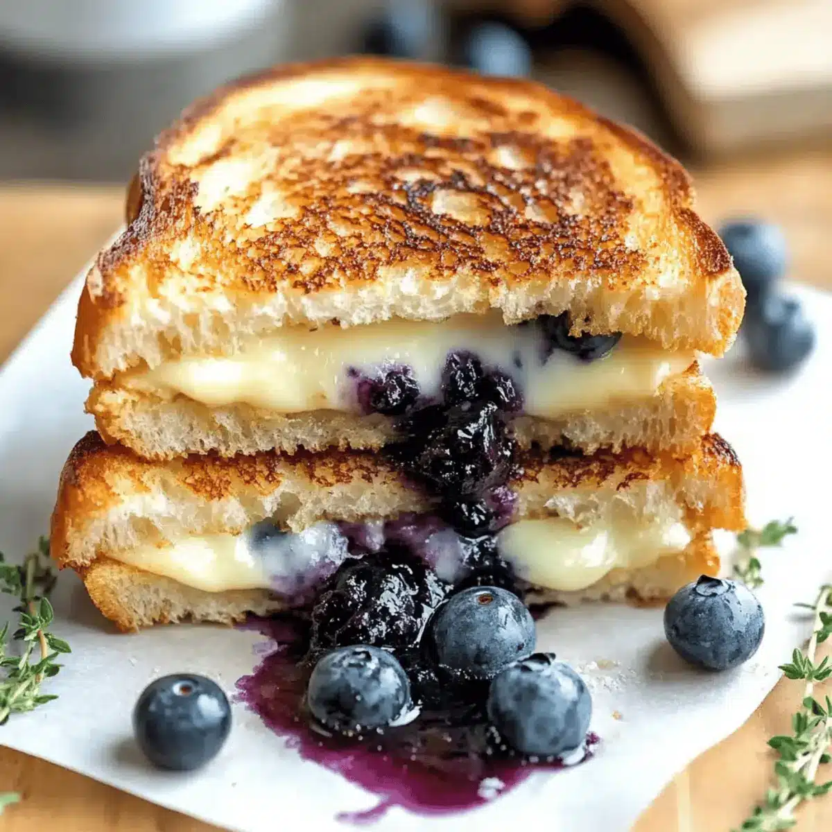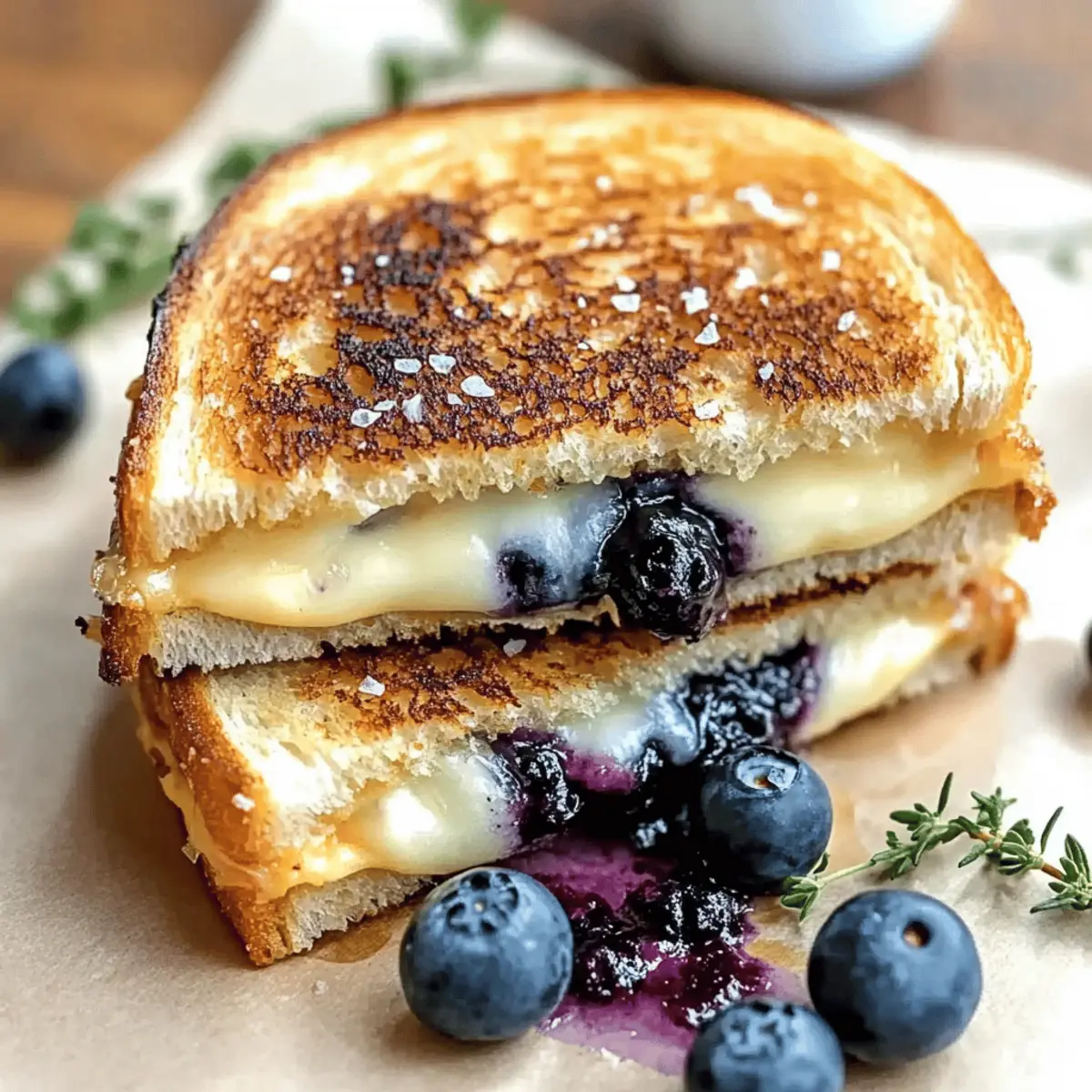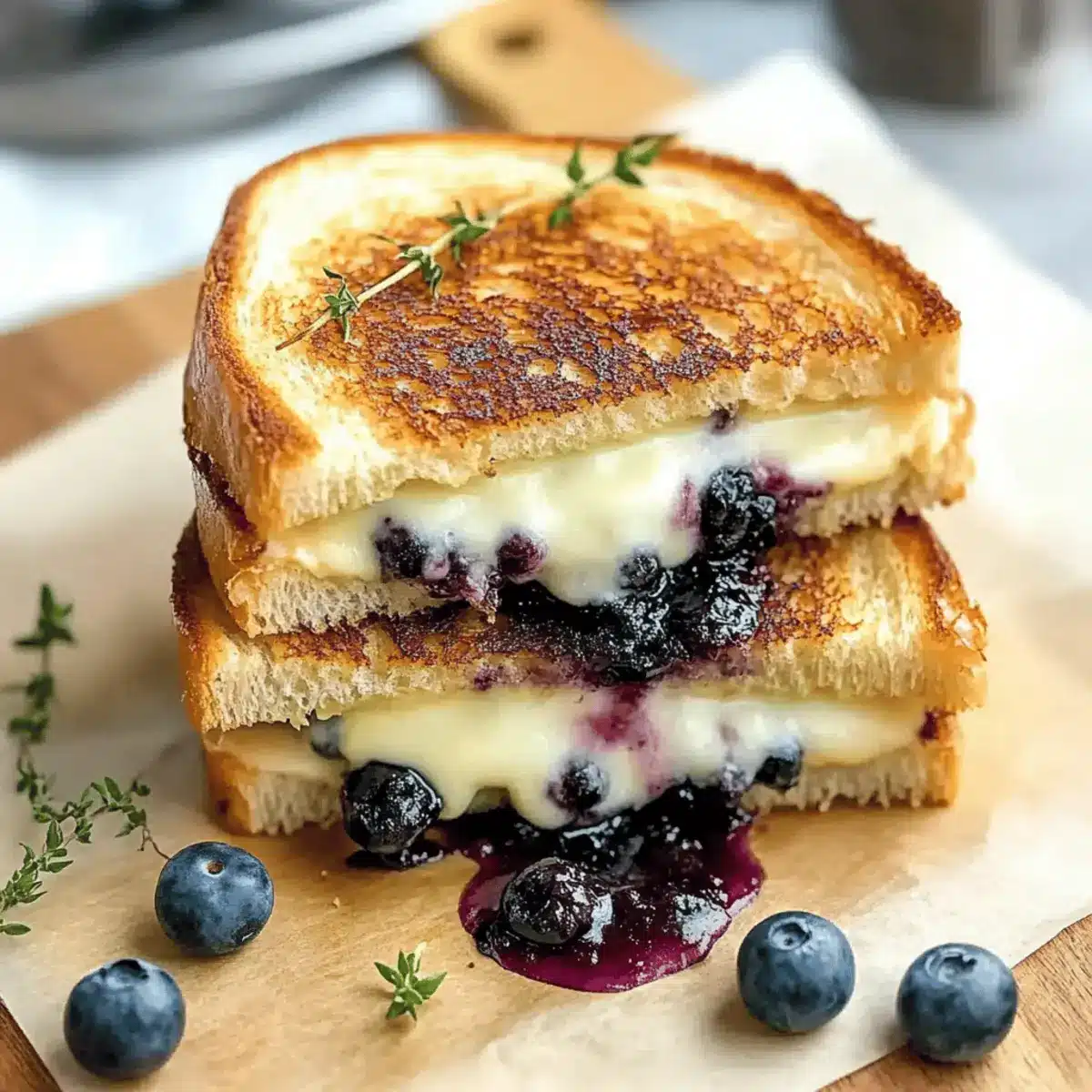 Once both sides are crispy and the cheese is delightfully gooey, remove the sandwiches from the skillet. Let them sit for a minute before slicing them in half, which lets the warm blueberry compote ooze out slightly. If desired, sprinkle with flaky sea salt and fresh thyme for an added touch before serving your Crispy Blueberry Grilled Cheese!