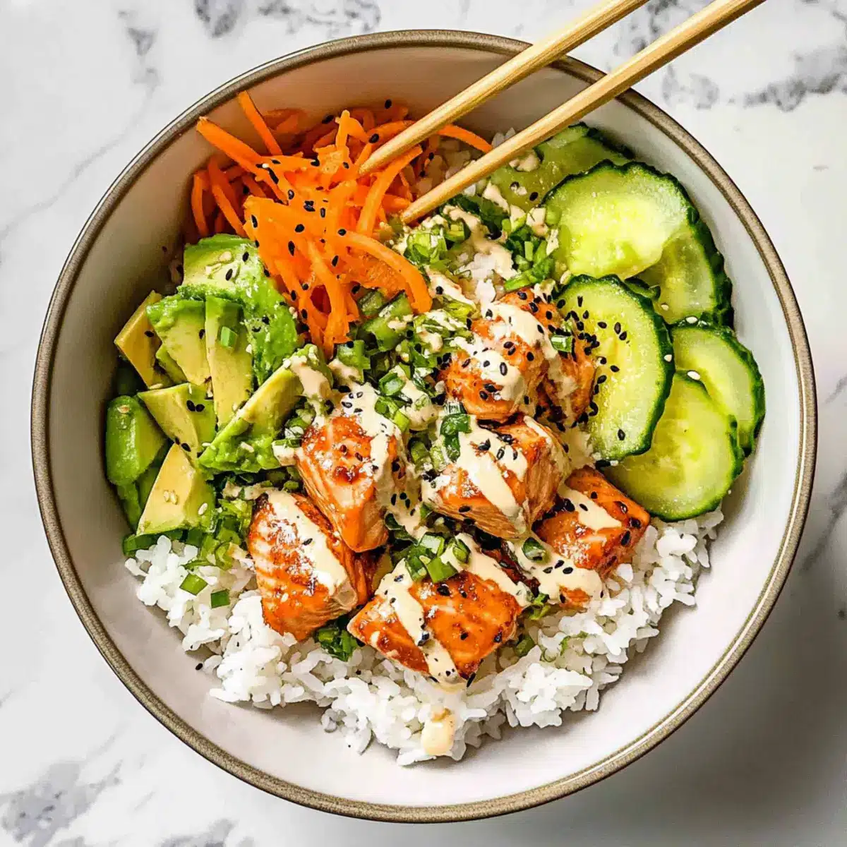 - To assemble the bowls, start with a scoop of seasoned rice, top with glazed salmon, avocado, cucumbers, carrots, and green onions.