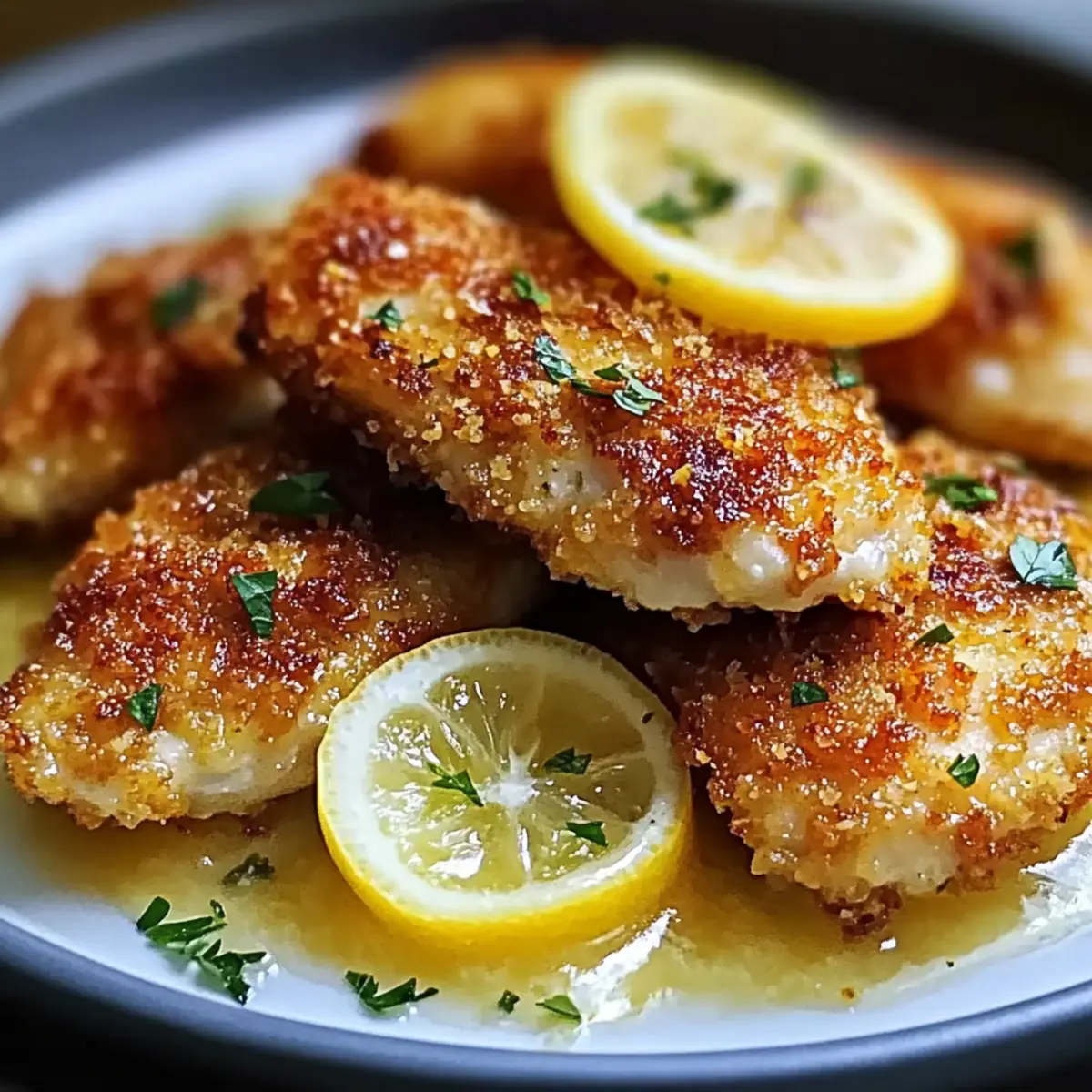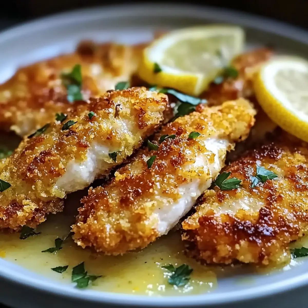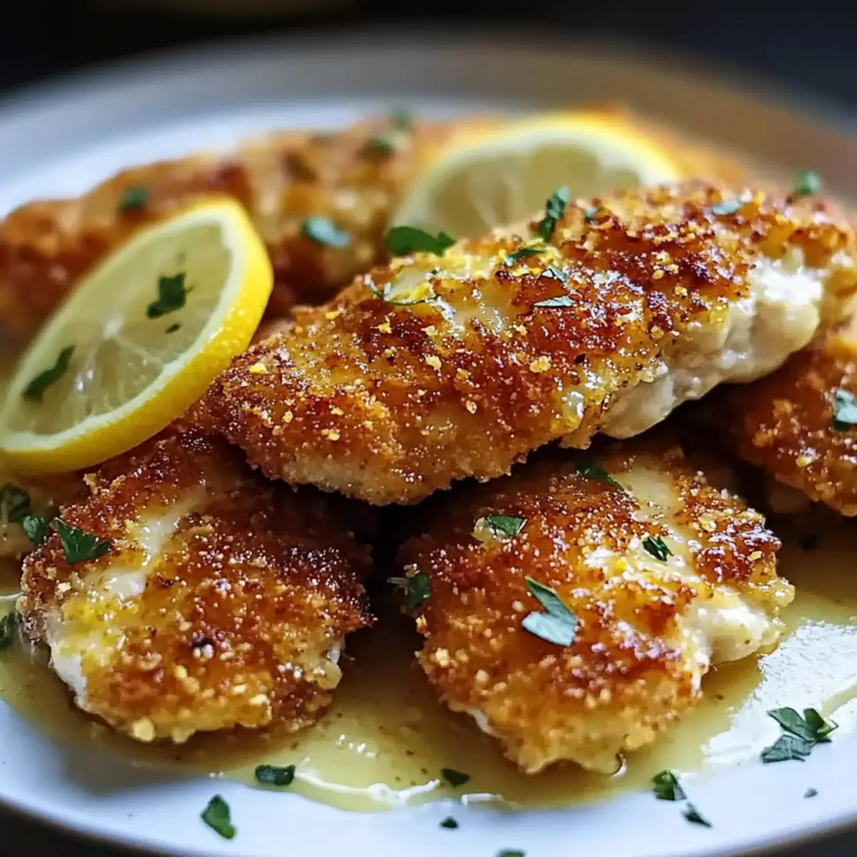 Place the crispy chicken tenderloins on plates and generously drizzle the creamy lemon sauce over the top. Garnish with fresh parsley to elevate the presentation of your Crispy Zesty Lemon Pecorino Chicken Delight. This enticing dish is now ready to be enjoyed!