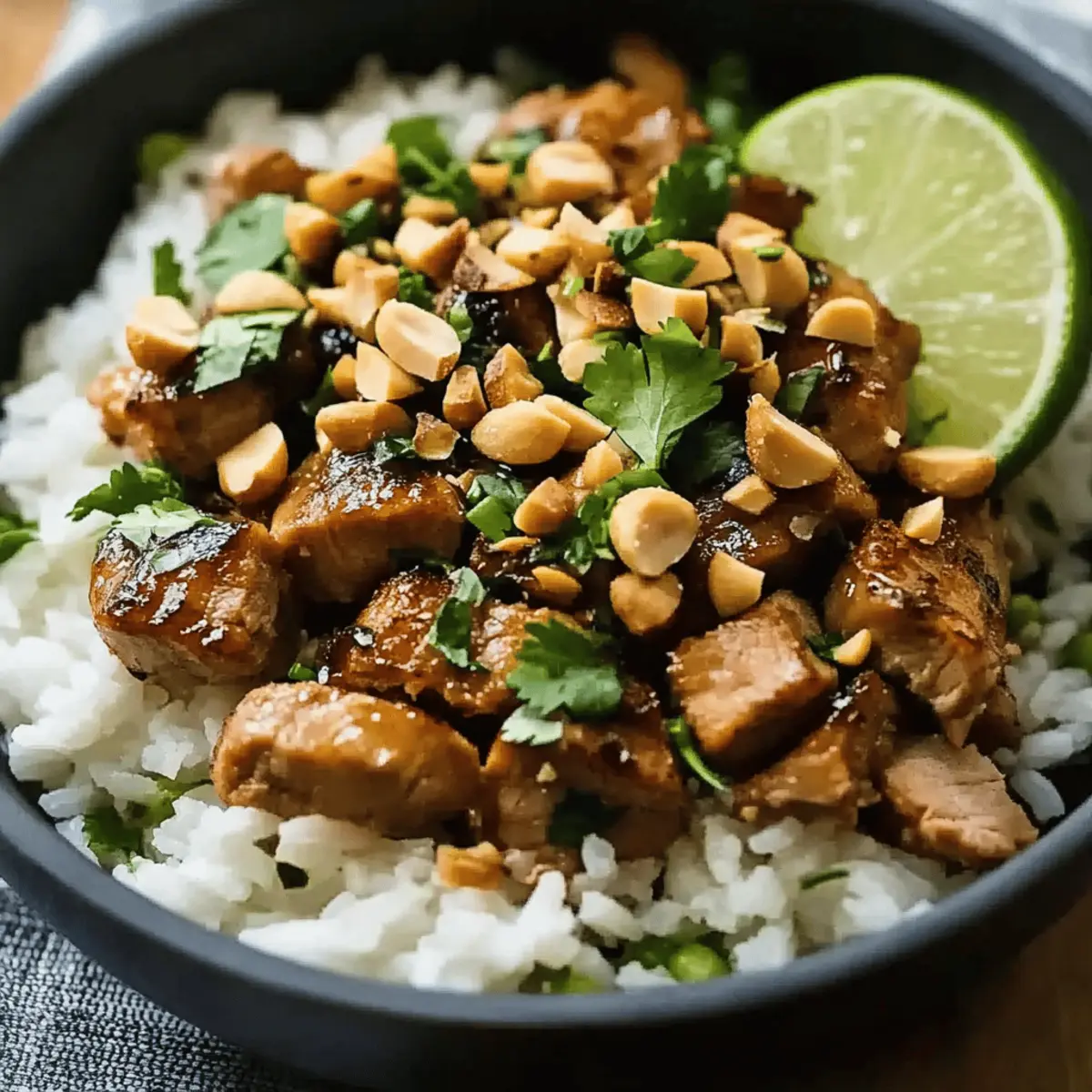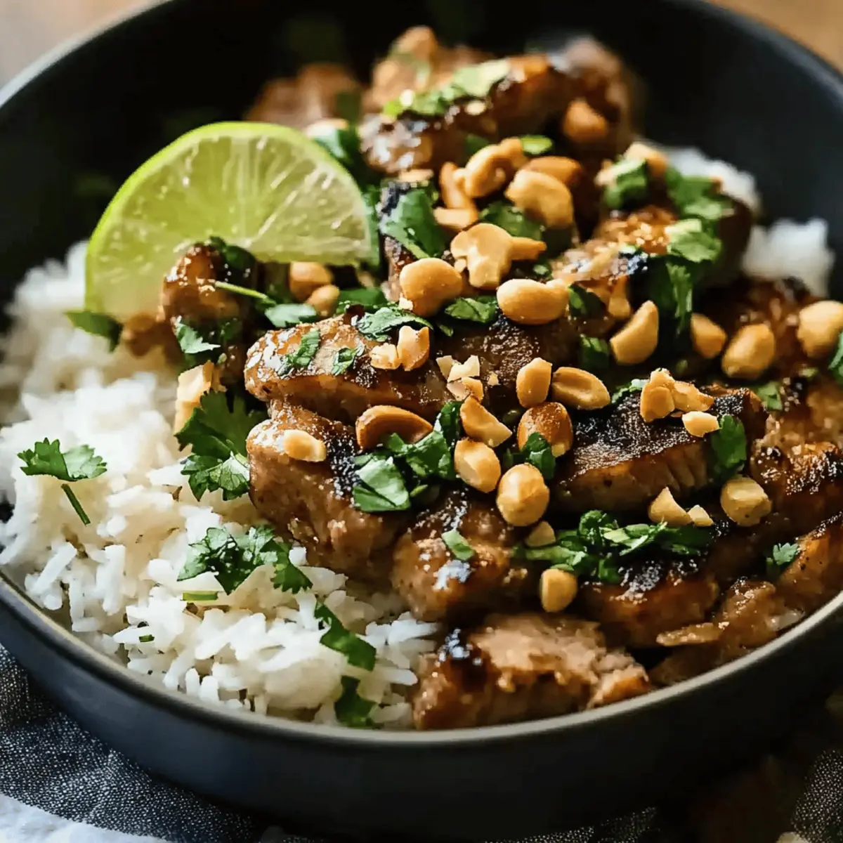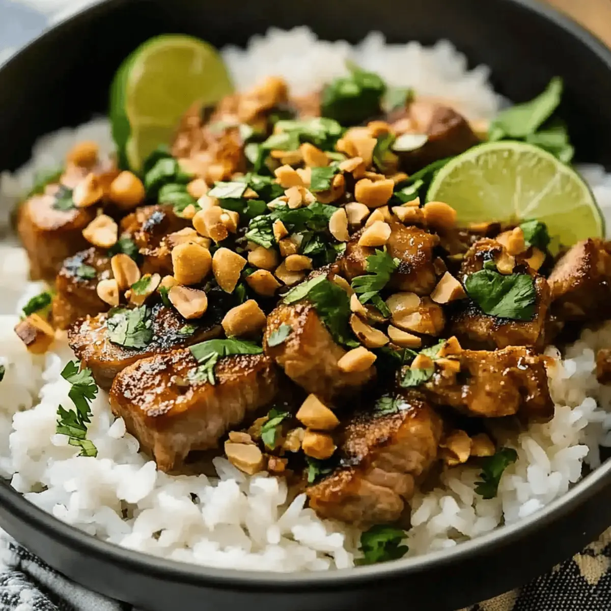 - To serve, place a scoop of coconut rice on each plate, top with pork, drizzle with sauce, and garnish with herbs and peanuts.