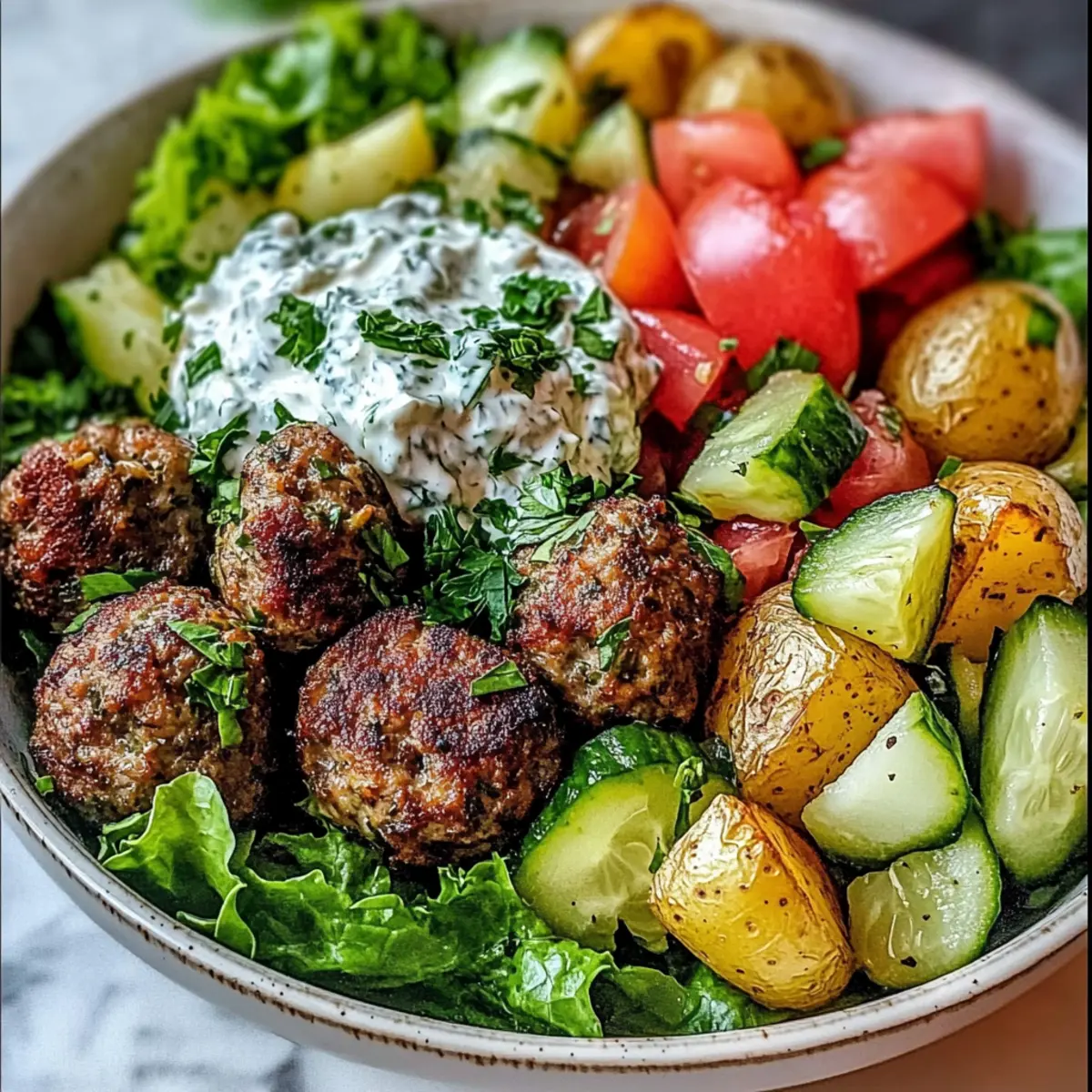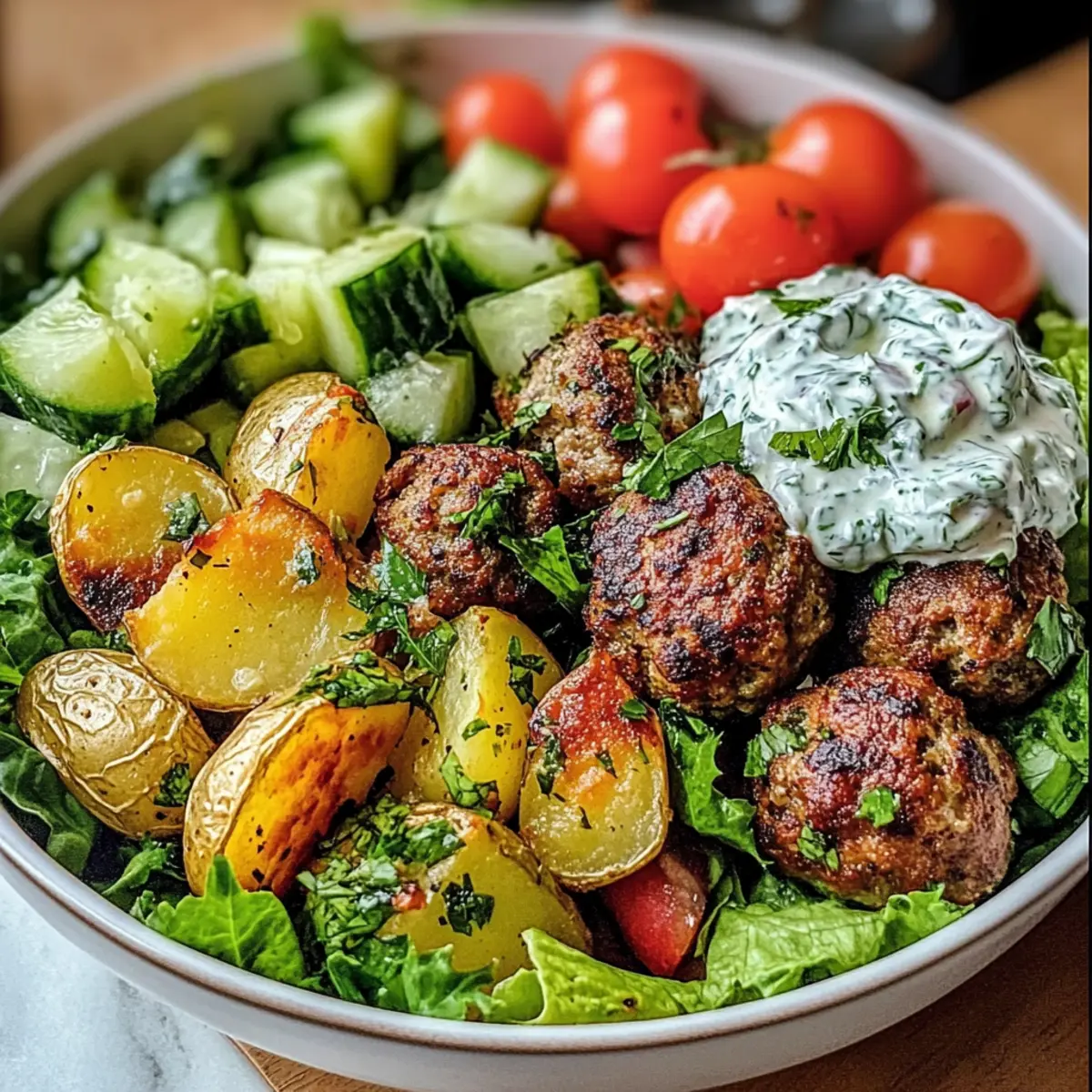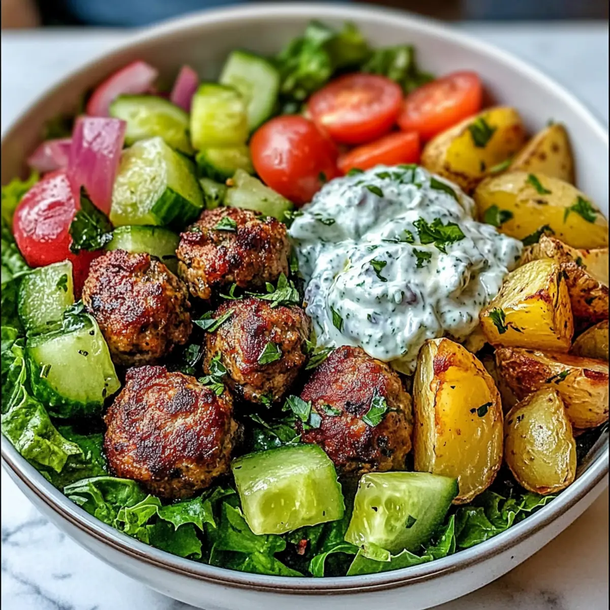 - Start with a generous layer of fresh lettuce at the bottom of each serving bowl. Add a handful of crispy roasted potatoes, followed by a few warm meatballs. Top with diced tomatoes, cucumber, and pitted Kalamata olives for a burst of freshness. Finish by drizzling the tangy tzatziki sauce over the top, and garnish with additional fresh herbs for a pop of color and flavor.