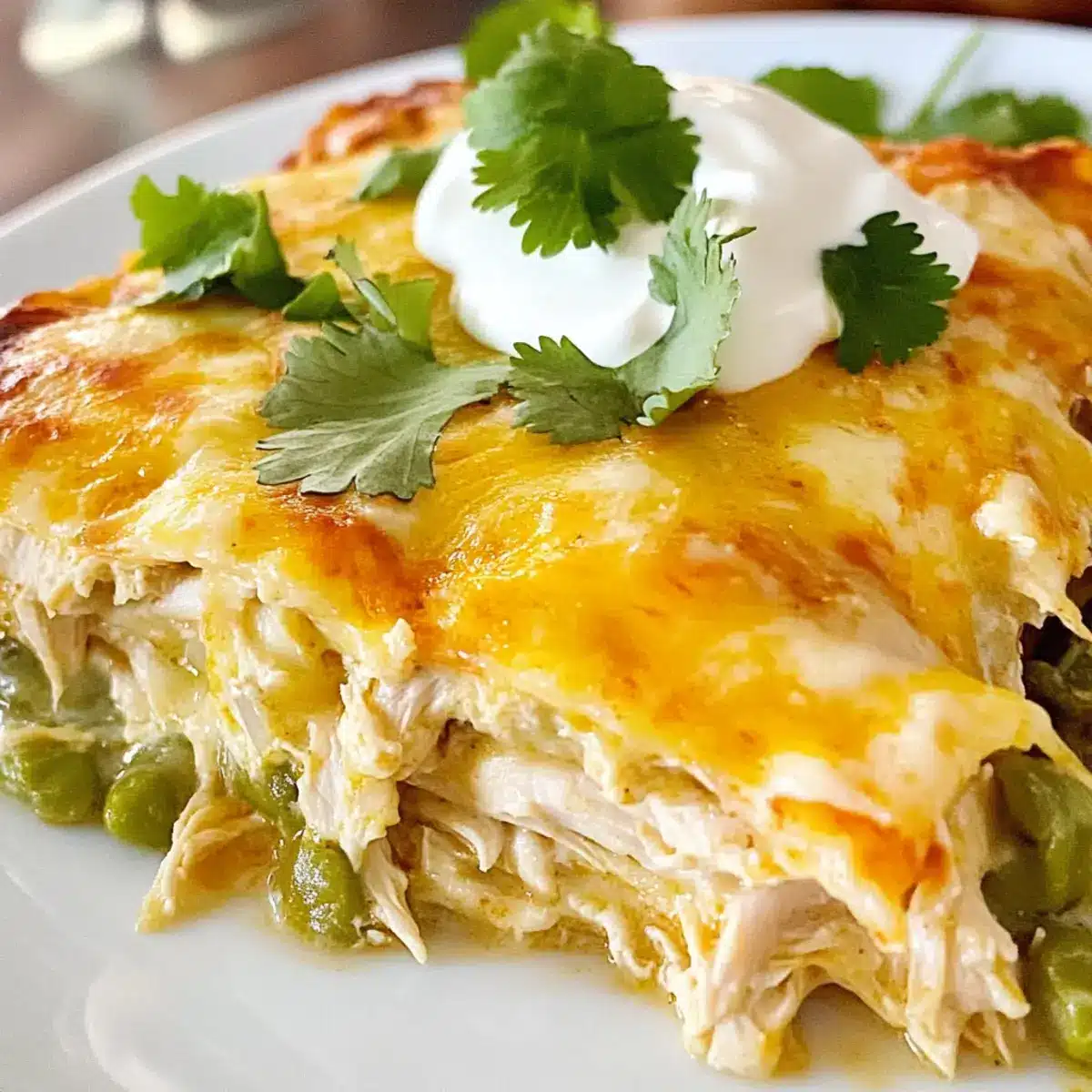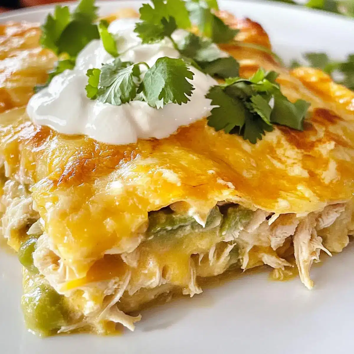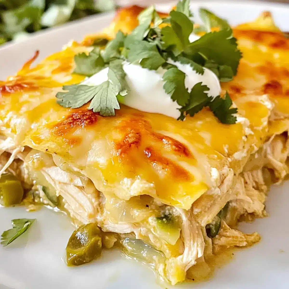 Once out of the oven, allow the casserole to cool for a few minutes to set. To serve, slice into squares and garnish with chopped fresh cilantro and a dollop of sour cream if desired. This cooling step enhances the flavors of your Green Chile Chicken Enchilada Casserole and makes every serving a delightful experience.