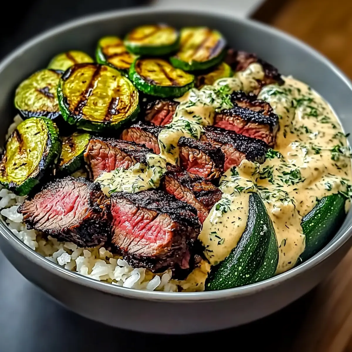 It’s time to bring your grilled steak bowl with sauce & grilled zucchini bliss together! Start by layering cooked rice or mashed potatoes as your base in a large bowl. Next, arrange the grilled zucchini atop the base, followed by slicing the rested steak into bite-sized pieces and layering it over the zucchini. Finally, drizzle a generous amount of the creamy herb sauce over your assembled bowl for a delectable finish.