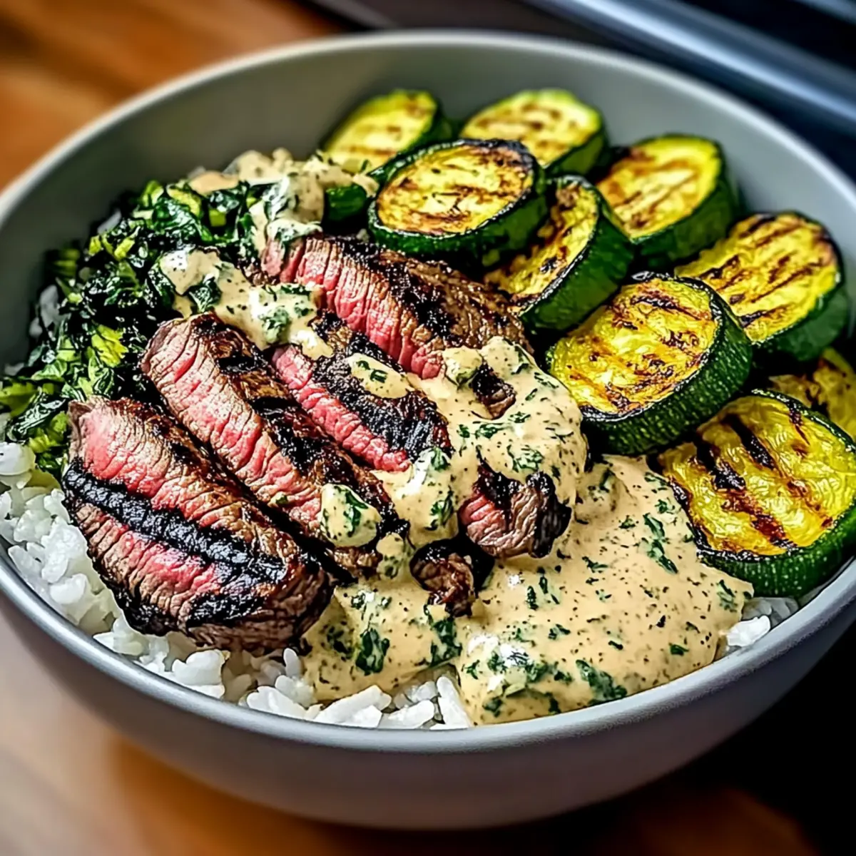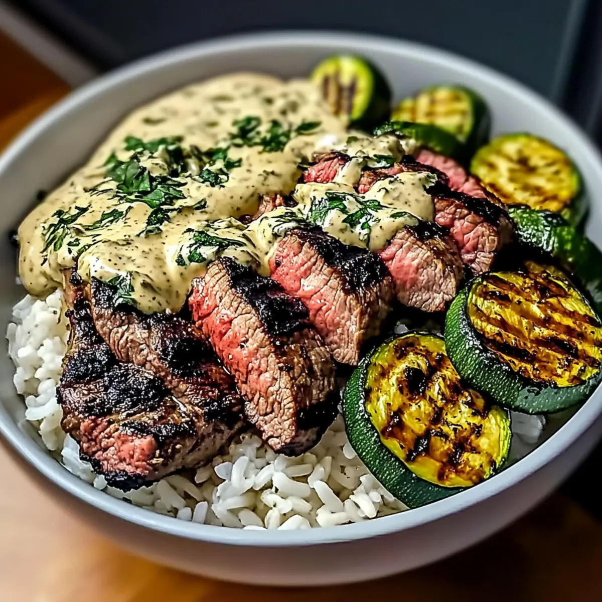 - Layer rice or mashed potatoes in a bowl, top with grilled zucchini and sliced steak, and drizzle sauce over the top.