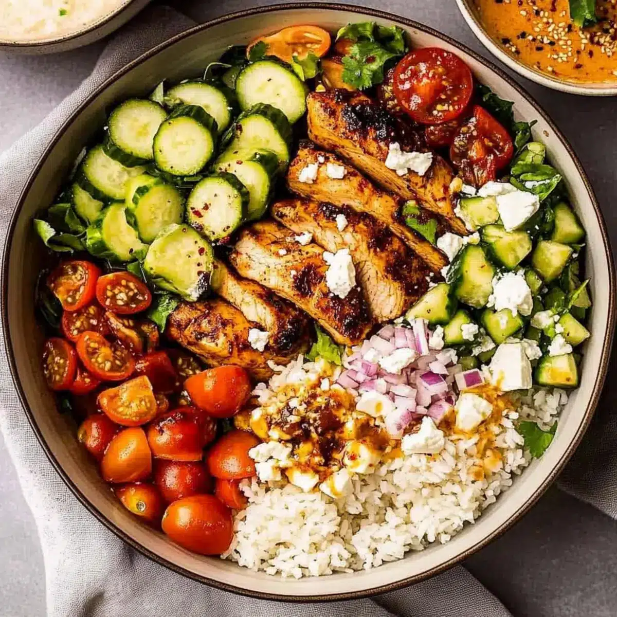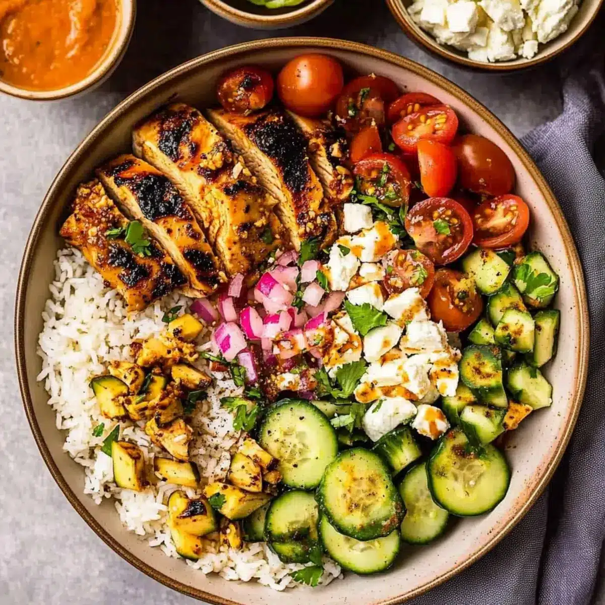 - Assemble the bowls with a scoop of steamed rice, sliced harissa chicken, sautéed corn, cherry tomatoes, Persian cucumbers, pickled onions, crumbled feta cheese, and a dollop of hummus. Drizzle with the prepared vinaigrette.