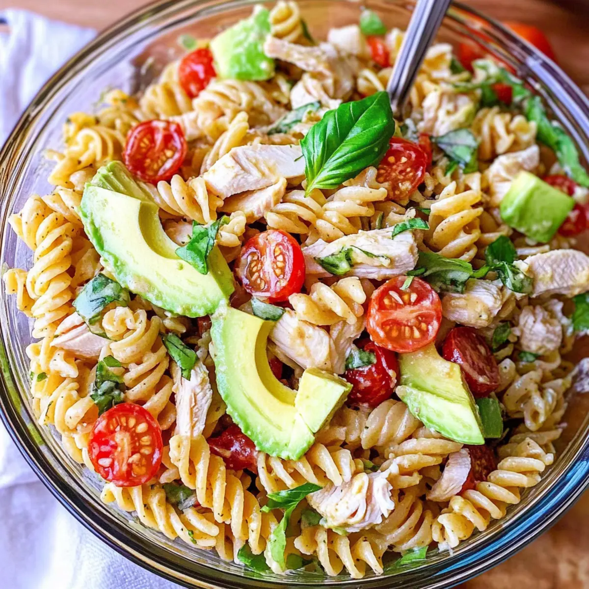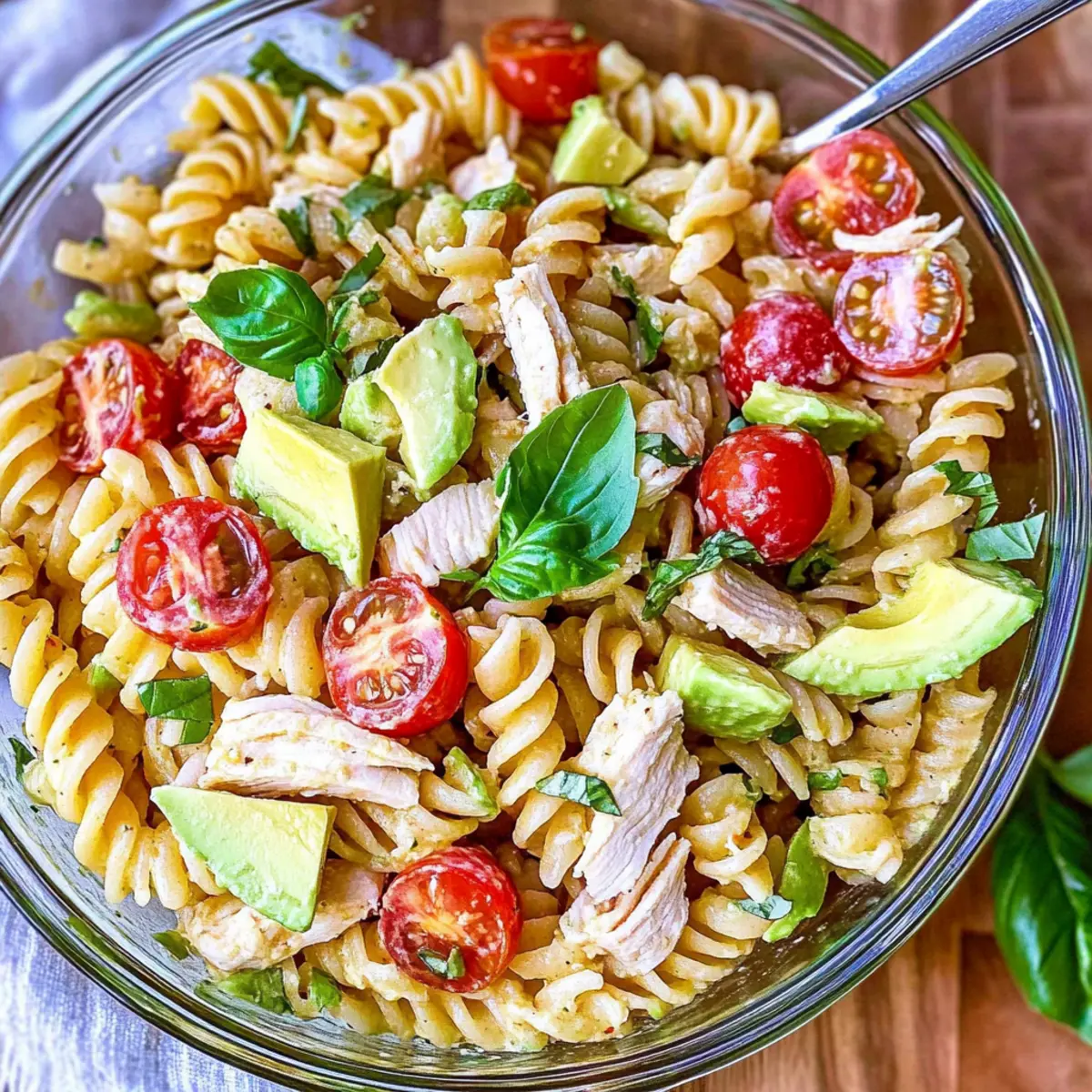 Healthy Chicken Pasta Salad with Avocado, Tomato, and Basil Delight