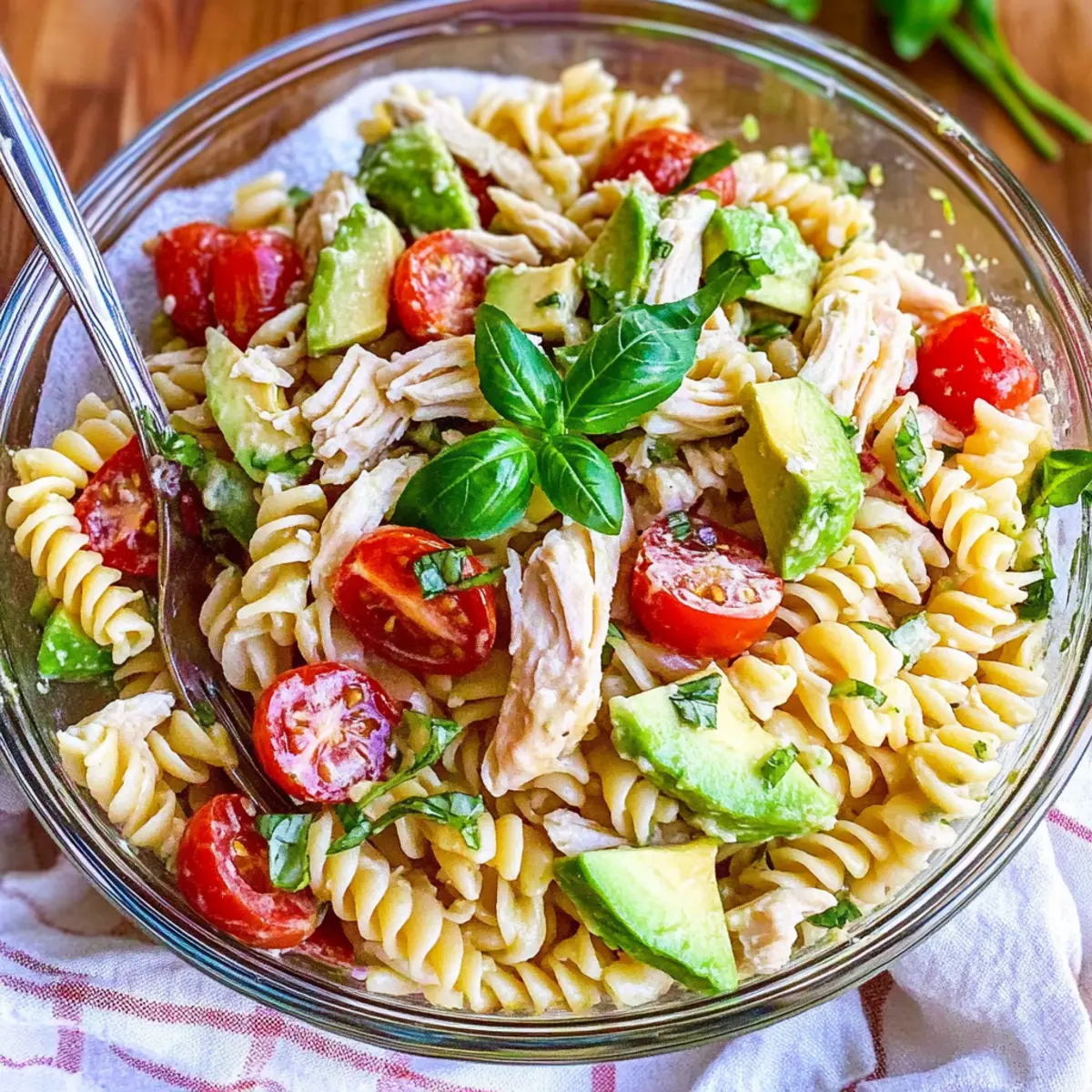Begin by cooking the rotini pasta according to package instructions, usually around 8-10 minutes until al dente. Drain and rinse under cold water to stop the cooking process, then set aside in a large mixing bowl. Add the shredded cooked chicken, diced avocado, halved cherry tomatoes, chopped basil, and finely diced red onion, ensuring a vibrant mix of colors and textures.