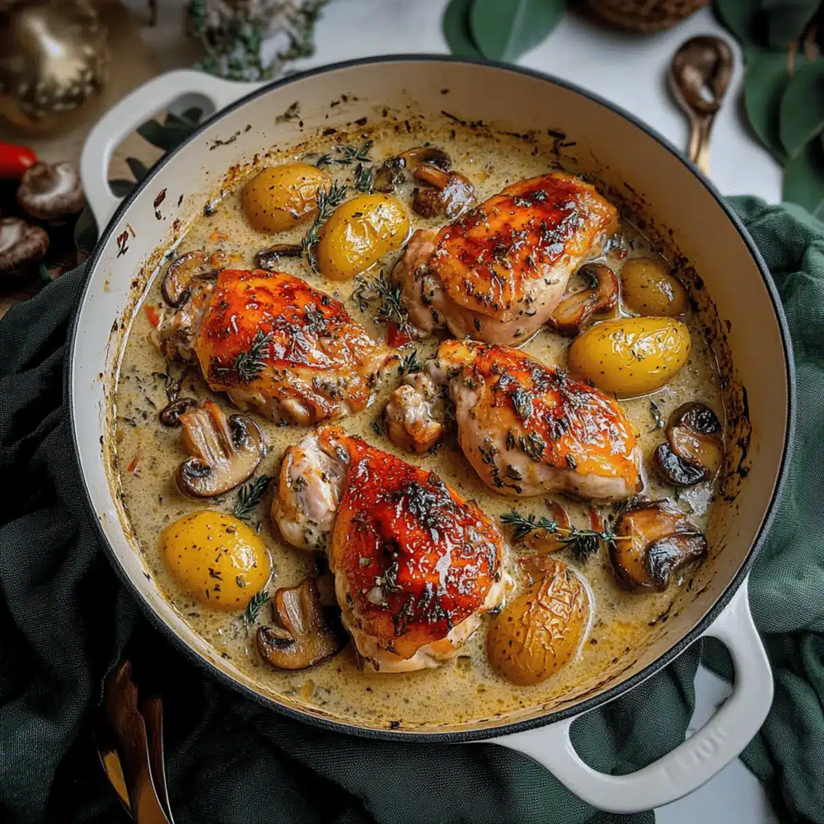 Add hearty baby potatoes to the fragrant sauce, ensuring they are submerged. Nestle the browned chicken pieces on top of the potatoes, skin-side up. Cover the Dutch oven and transfer it into a preheated oven at 375°F (190°C). Roast for 40-45 minutes until the internal temperature of the chicken reads 165°F, and the potatoes become tender.