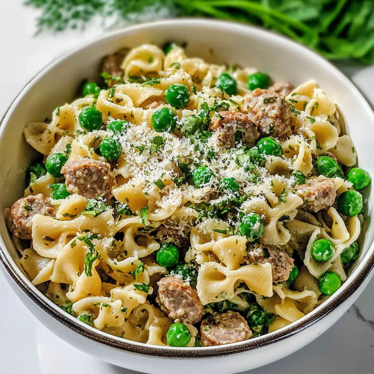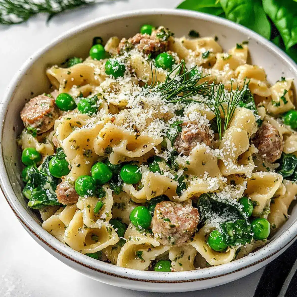 - Once the sauce is ready, lower the heat and stir in the browned protein, sautéed onions, and cooked pasta. Add in the fresh spinach, frozen peas, lemon zest and juice, grated Parmesan, chopped chives, salt, and black pepper. Mix until everything is evenly coated.