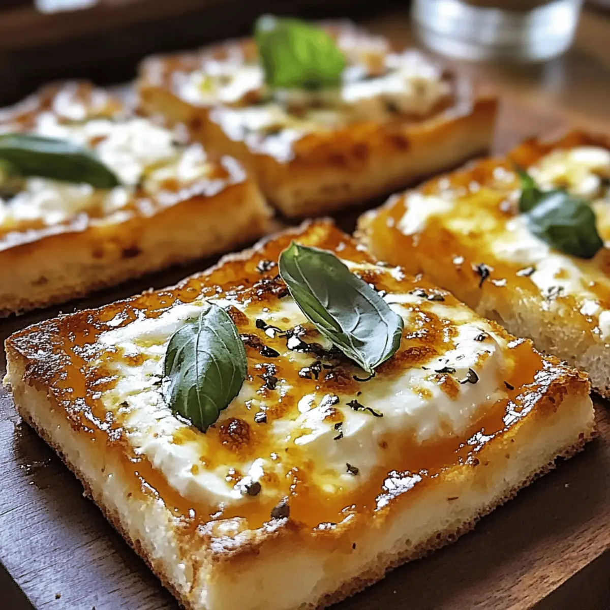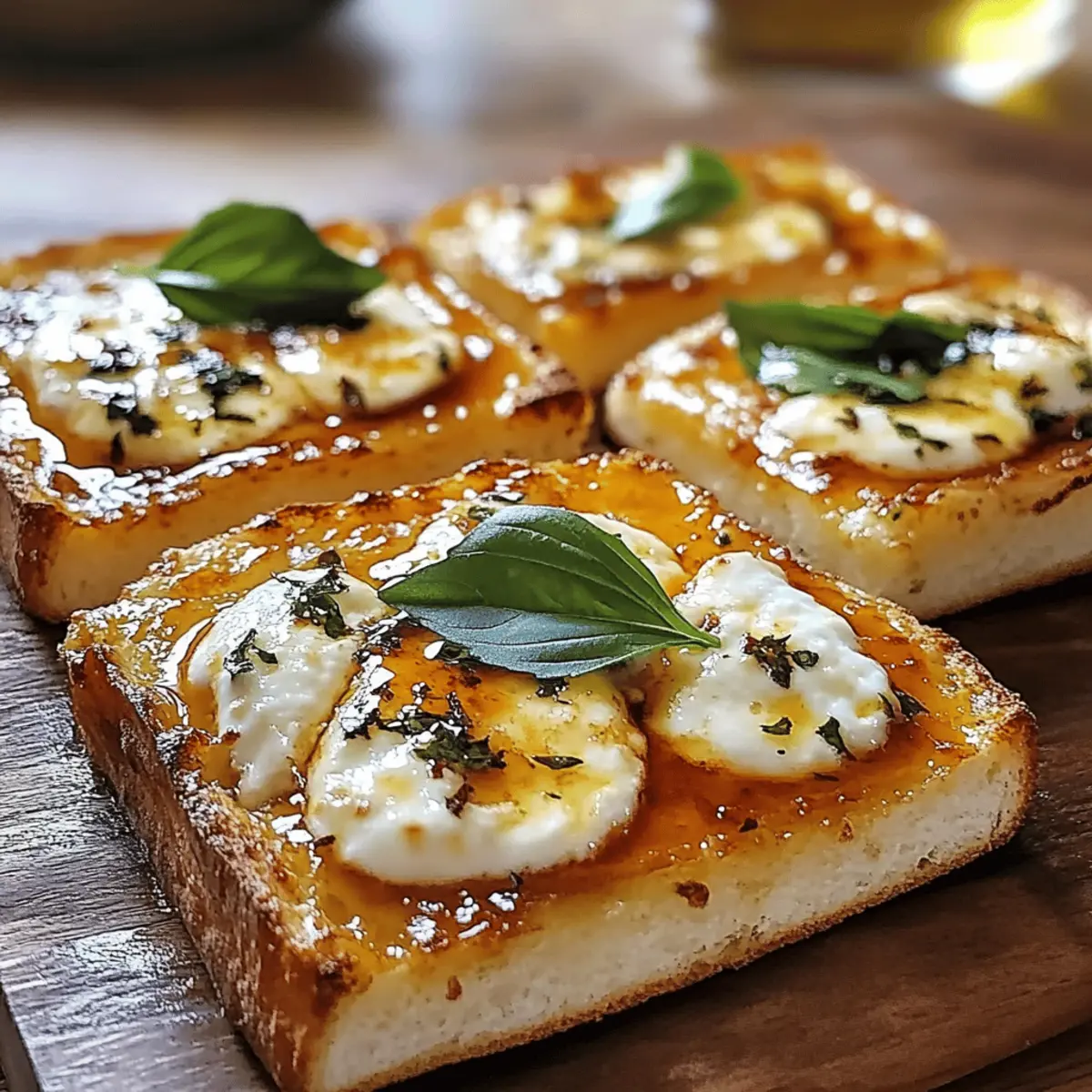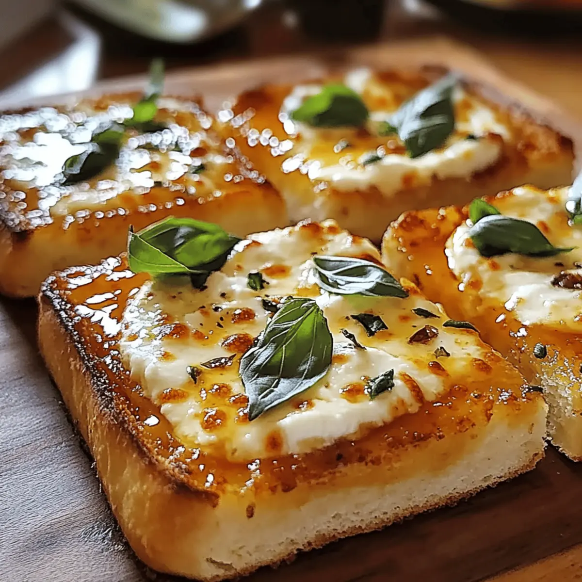 Next, spoon dollops of ricotta cheese across the garlic bread, creating a beautiful and creamy layer. Follow this with a generous sprinkle of shredded mozzarella cheese, ensuring every part of the bread is covered. This cheesy combination will melt beautifully, contrasting against the spicy-sweet honey.