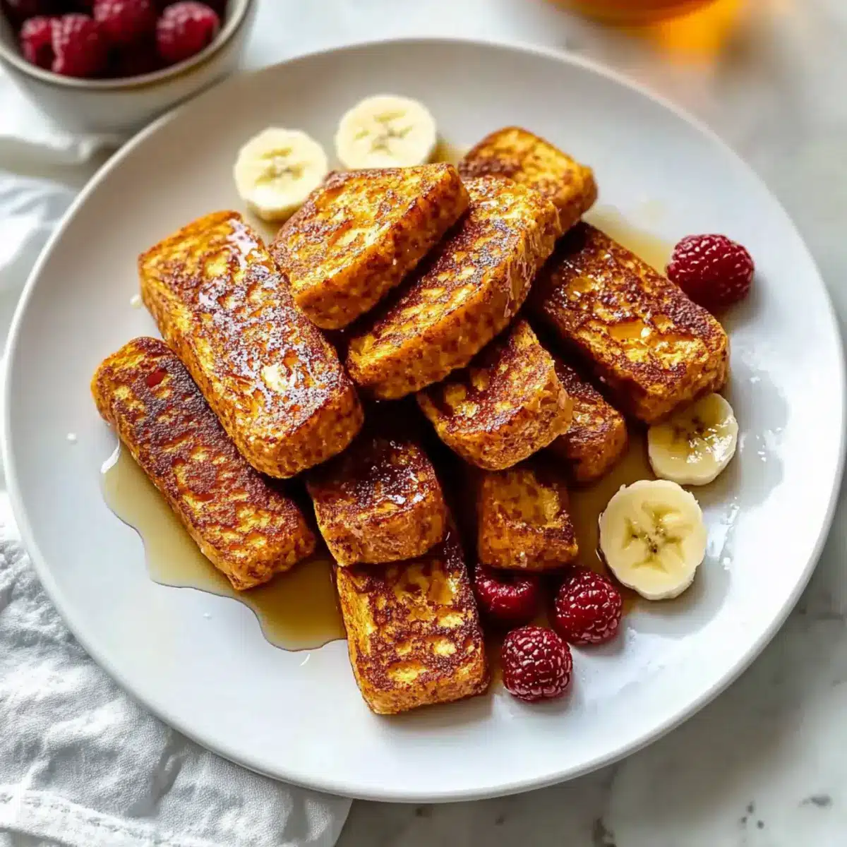 - Remove the French toast strips from the pan and serve immediately, optionally garnished with fresh fruit or pure maple syrup.