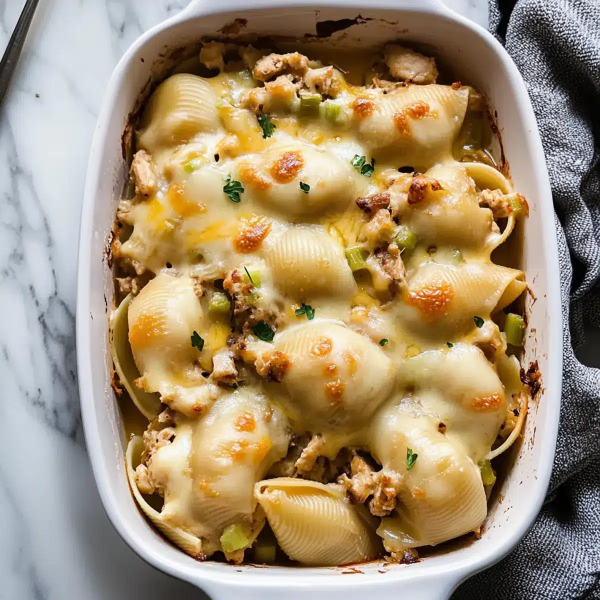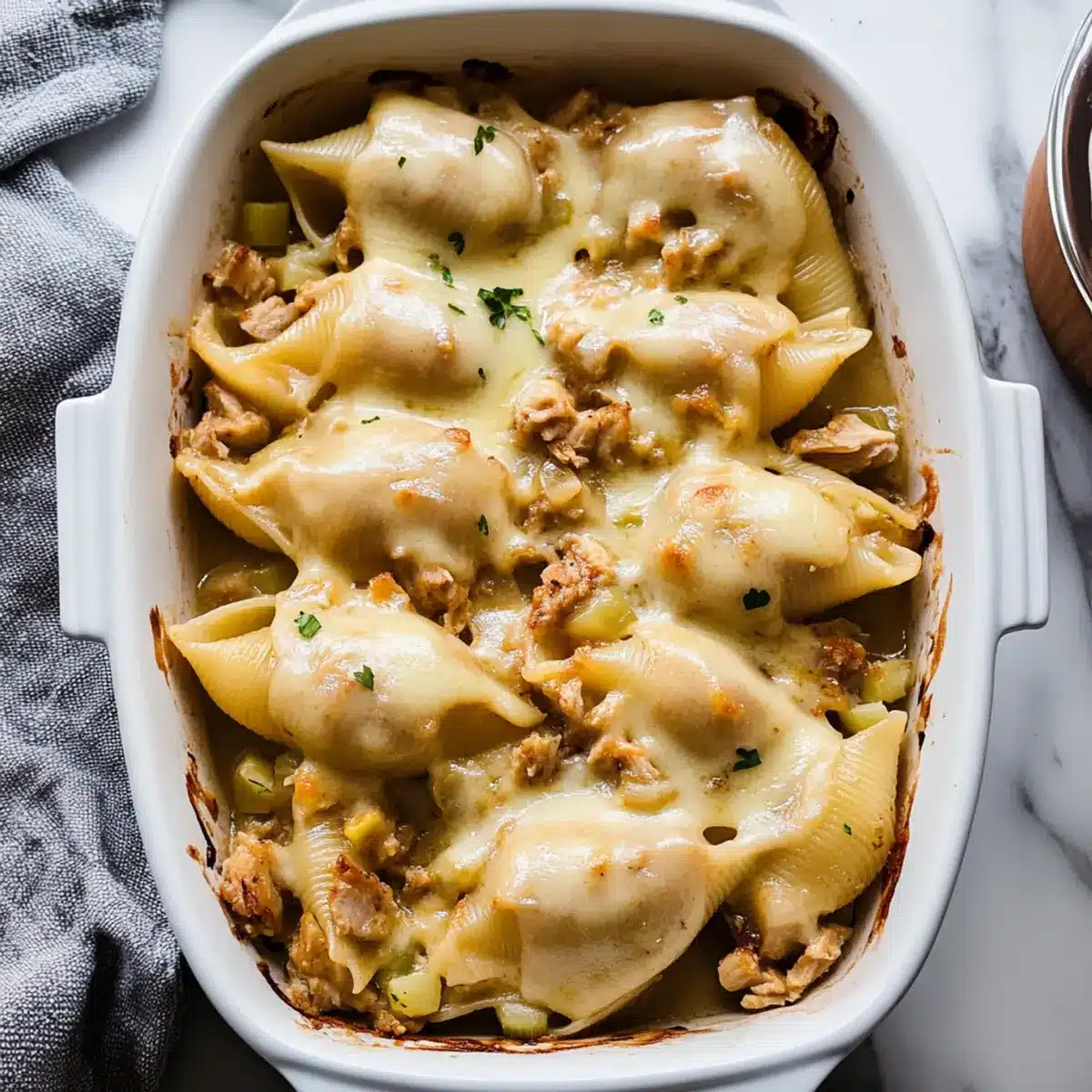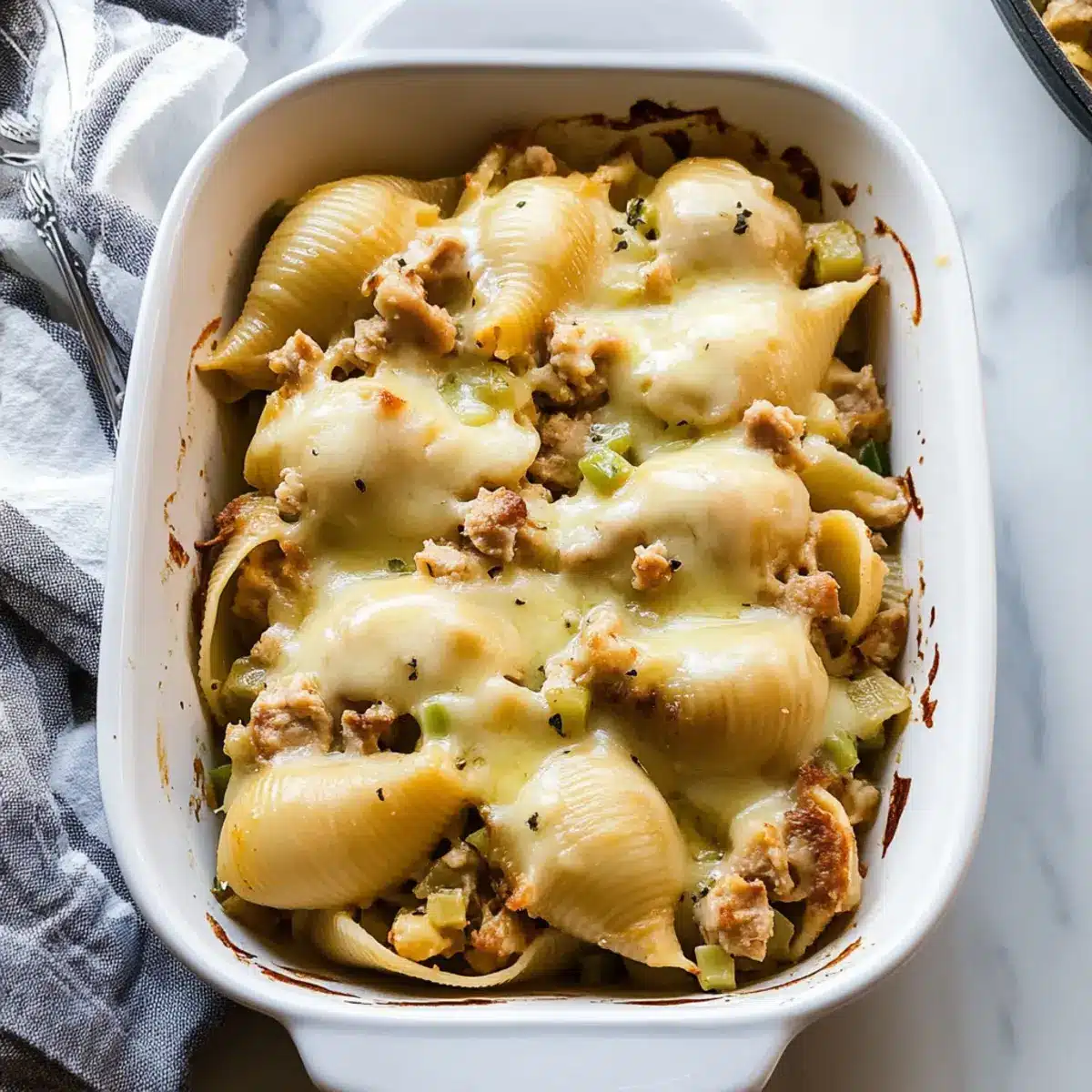 - Assemble the Dish: Spread about ¾ cup of gravy across the bottom of the baking dish. Fill each shell with the turkey mixture and arrange them snugly in the dish.