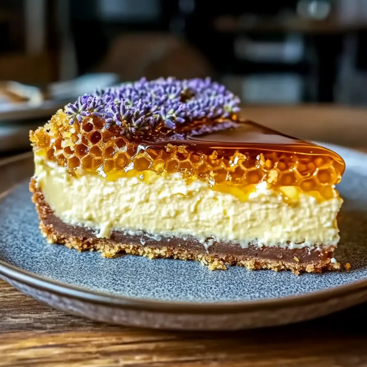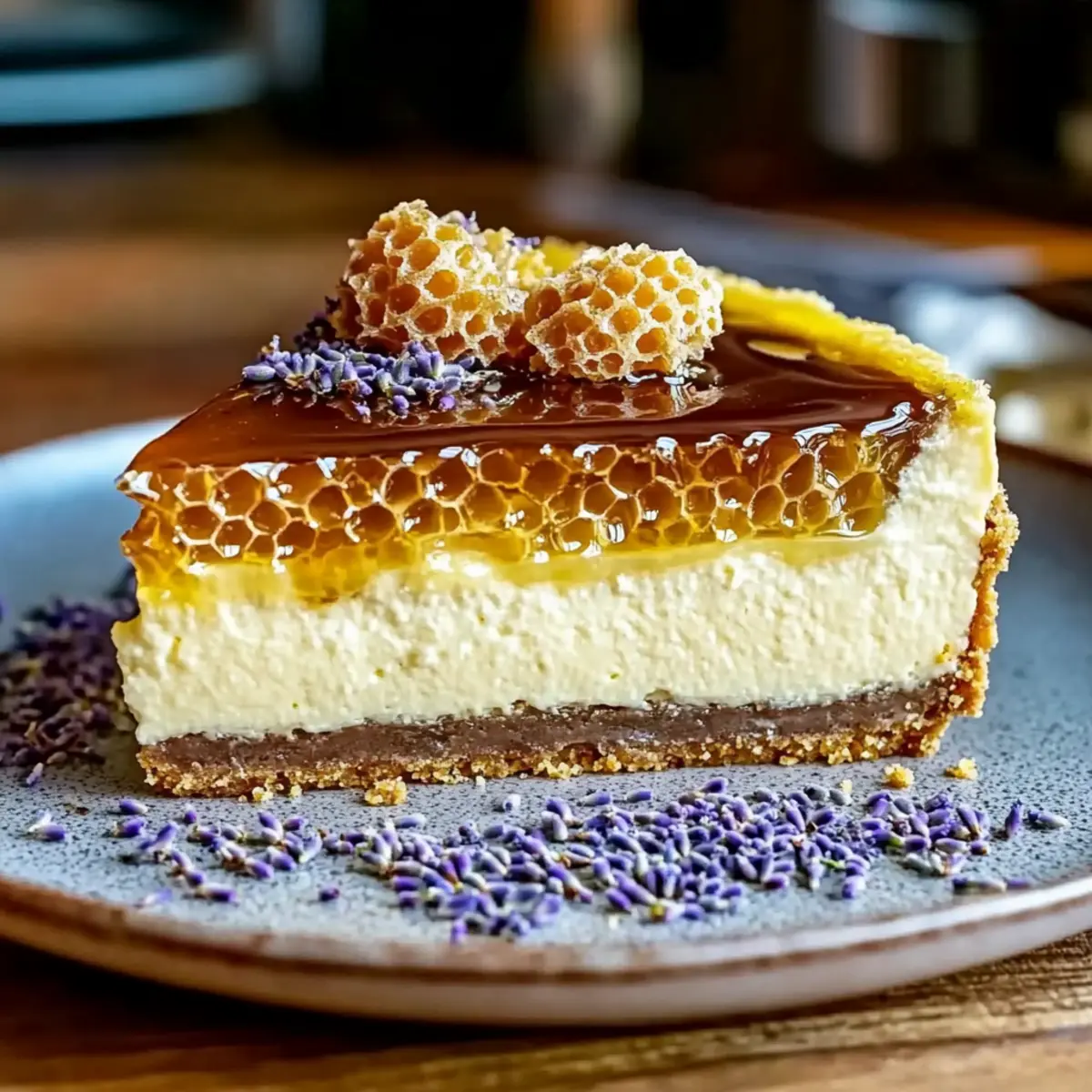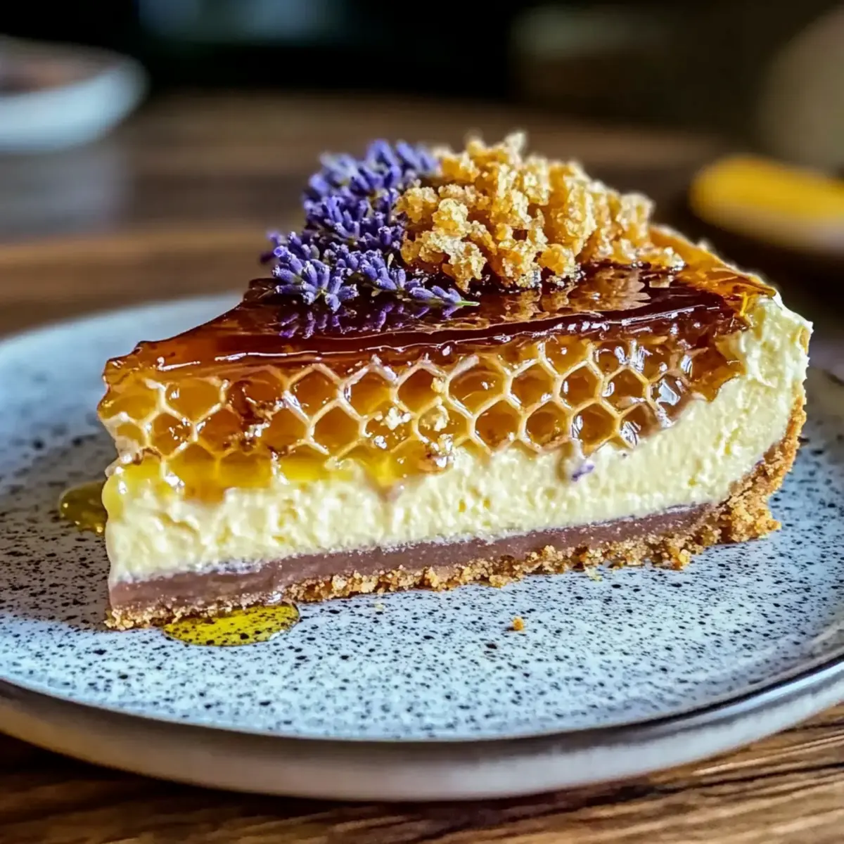 - Remove the cheesecake from the pan, top with honeycomb, drizzle honey, and garnish with lavender buds and lemon zest.