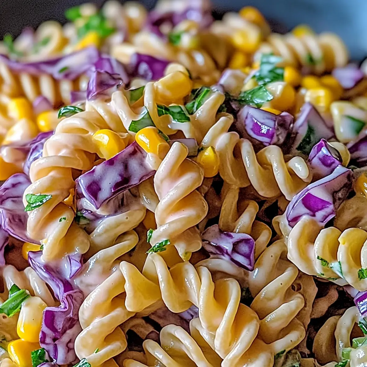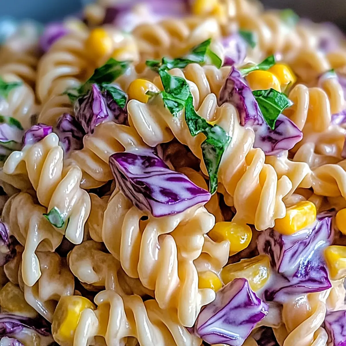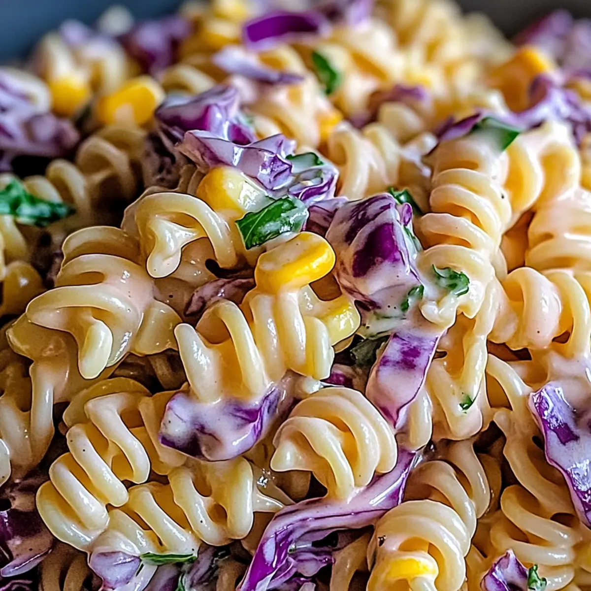- Next, fold in the colorful shredded purple cabbage and the finely chopped green onions to the pasta and corn mixture. Stir gently to ensure everything is well combined, creating a vibrant sight.