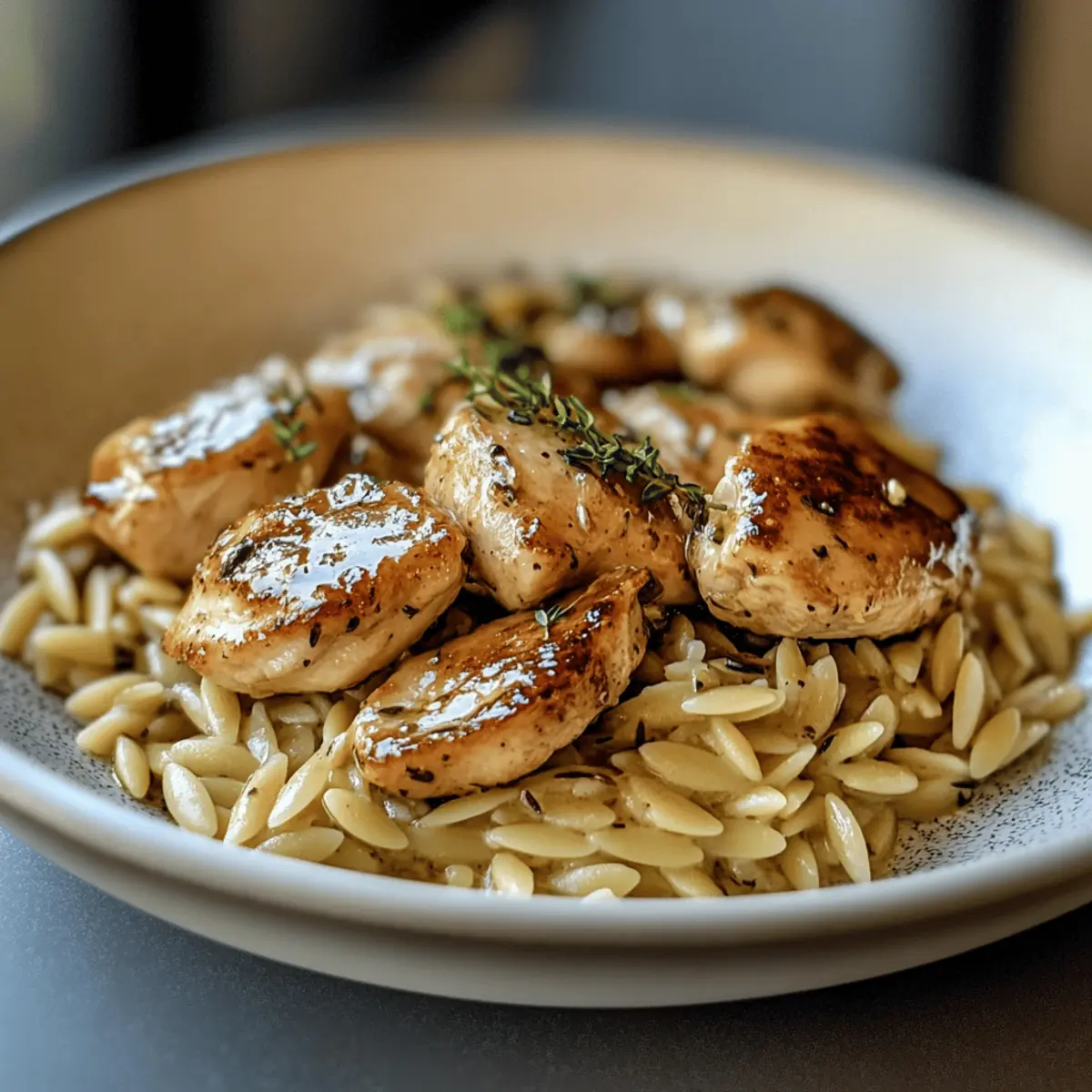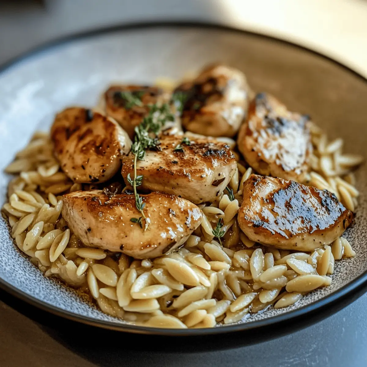 - Serve orzo topped with chicken and sauce, garnished with fresh herbs.