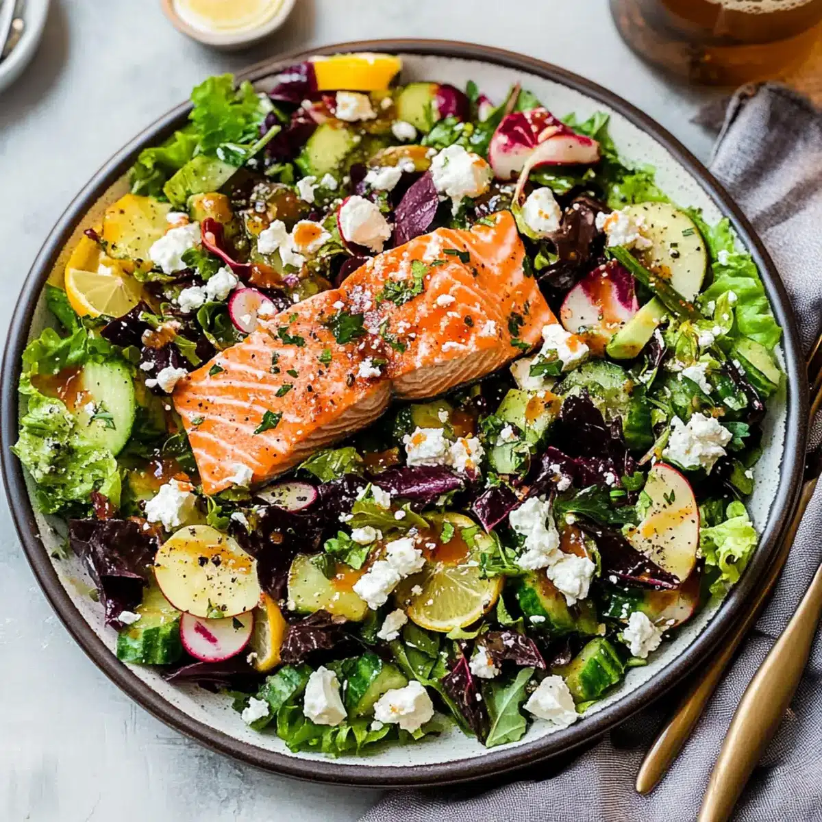 As I sliced into the vibrant vegetables for this Mediterranean Salmon Salad, the colors popped like a painter’s palette – deep greens, rich purples, and sunny yellows beckoning from my kitchen counter. This delightful combination of tender salmon, fresh garden veggies, and a zesty lemon-dijon vinaigrette not only makes a stunning centerpiece for your table but also a wonderful way to nourish your body with wholesome ingredients. It can transform your weeknight dinner into something unexpectedly elegant, all while being quick to prepare. With each bite, you’ll savor the balance of flavors, from the creaminess of feta cheese to the satisfying crunch of cucumbers. Are you ready to bring a taste of the Mediterranean to your kitchen?