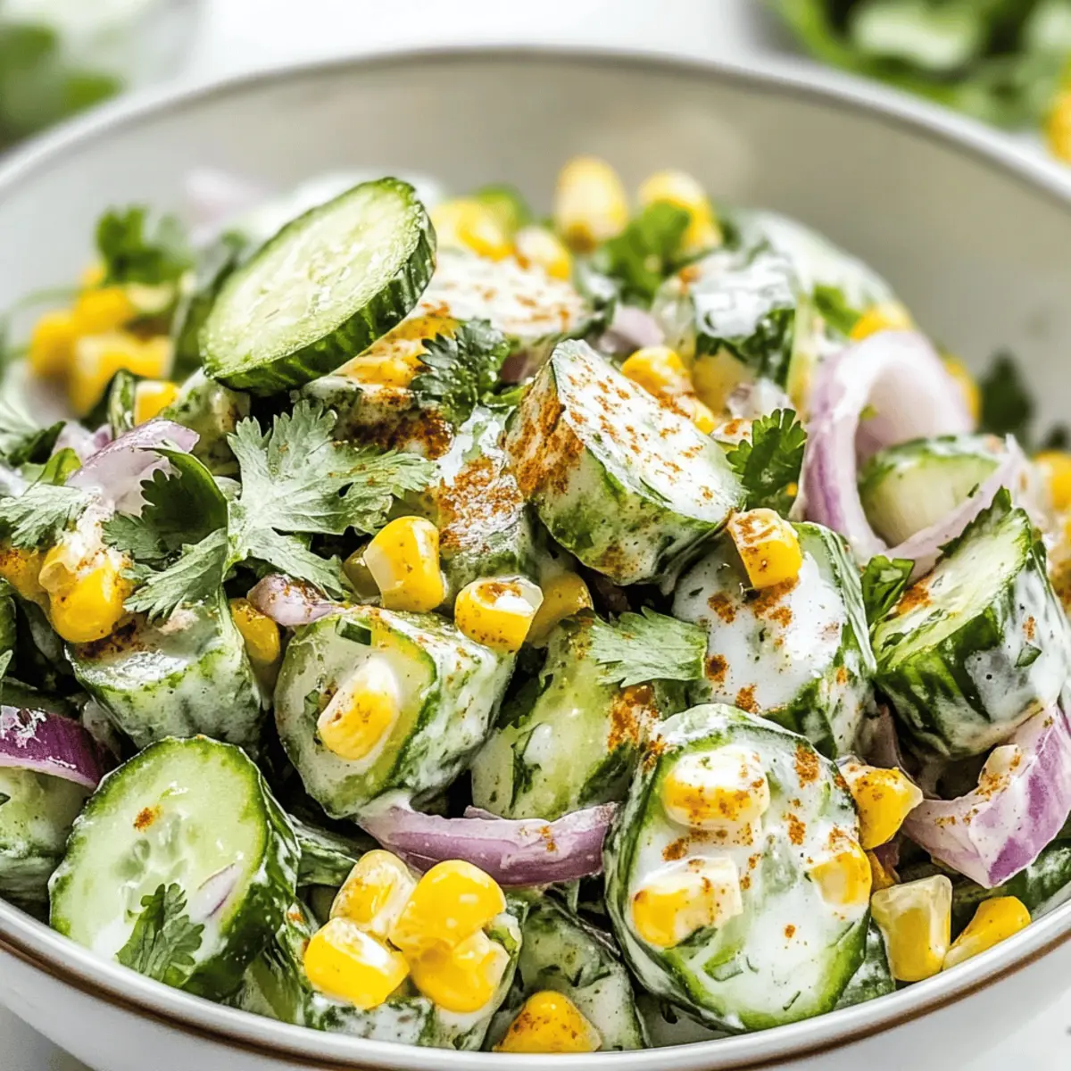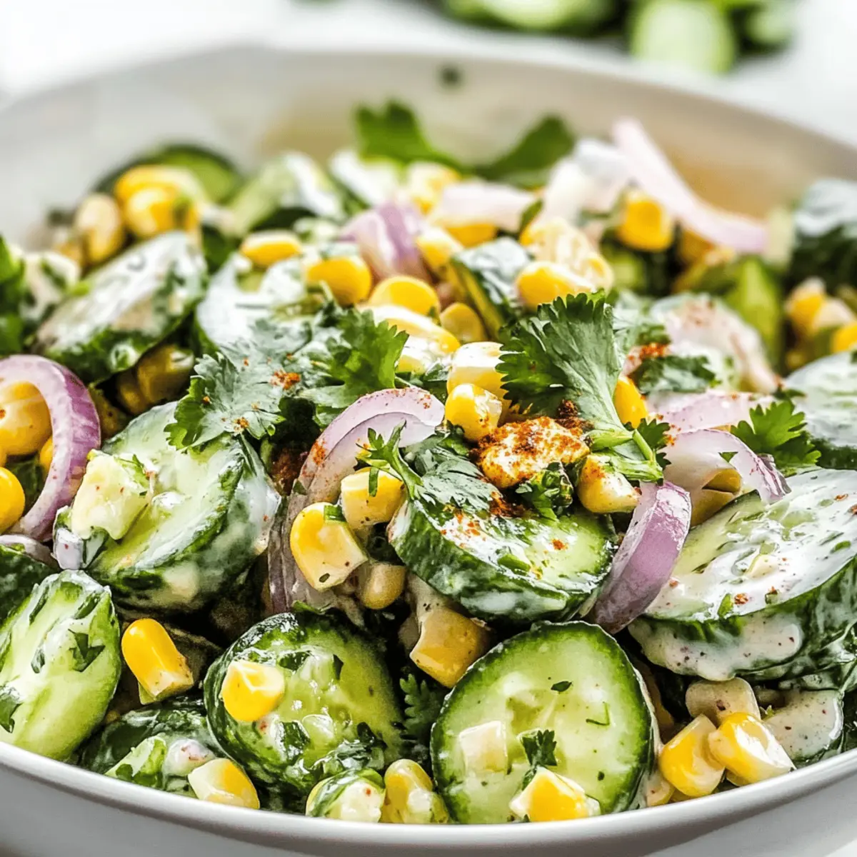 Fresh, Vibrant Ingredients: Crisp cucumbers and sweet corn come together to create a colorful dish that appeals to all palates.