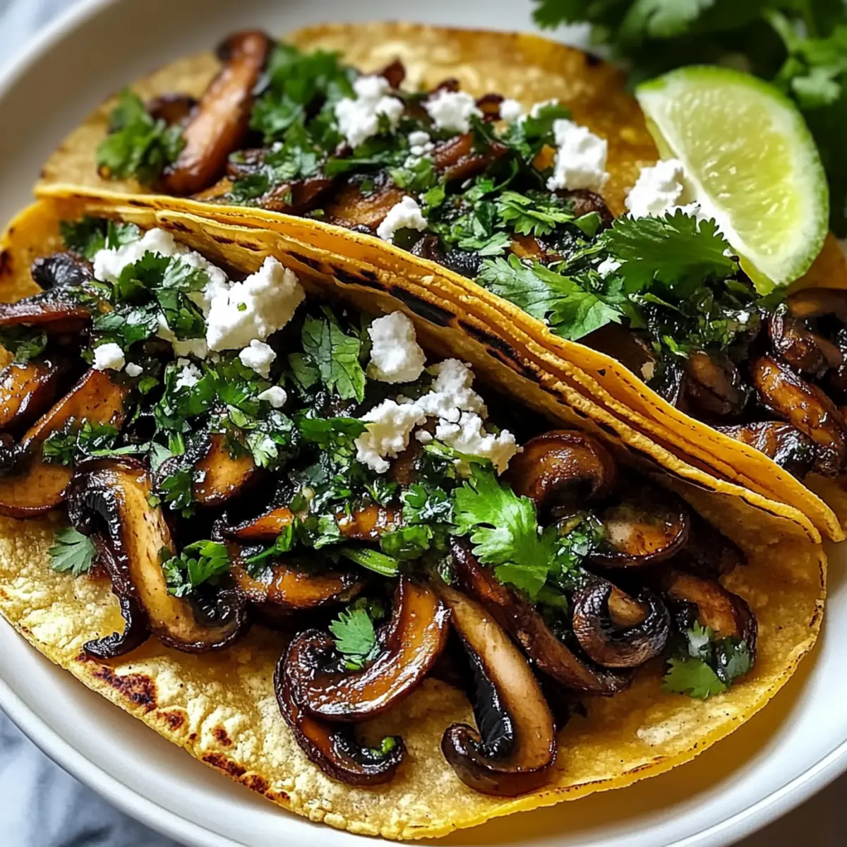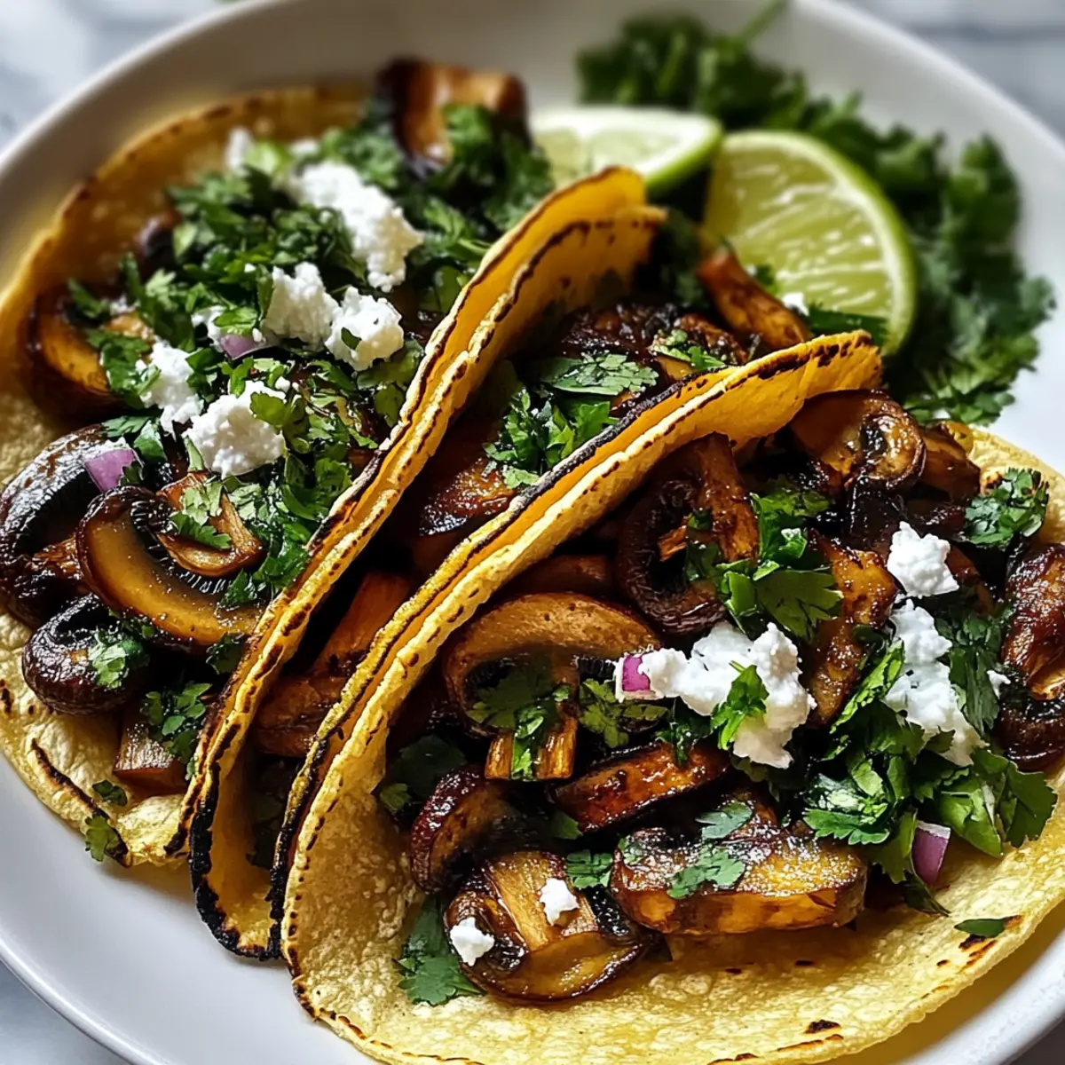 Once the tortillas are warm, spoon the mushroom filling generously into each tortilla. Top with crumbled cotija cheese and additional cilantro, if desired. Serve your Mushroom Tacos immediately with lime wedges on the side for an extra zesty kick. Enjoy the vibrant flavors and satisfying textures of this delightful dish!