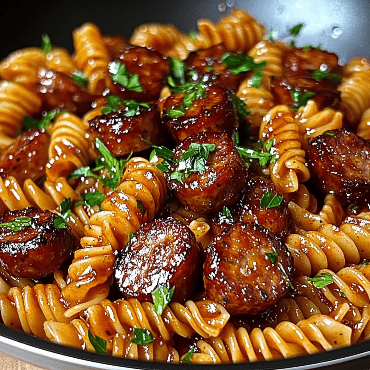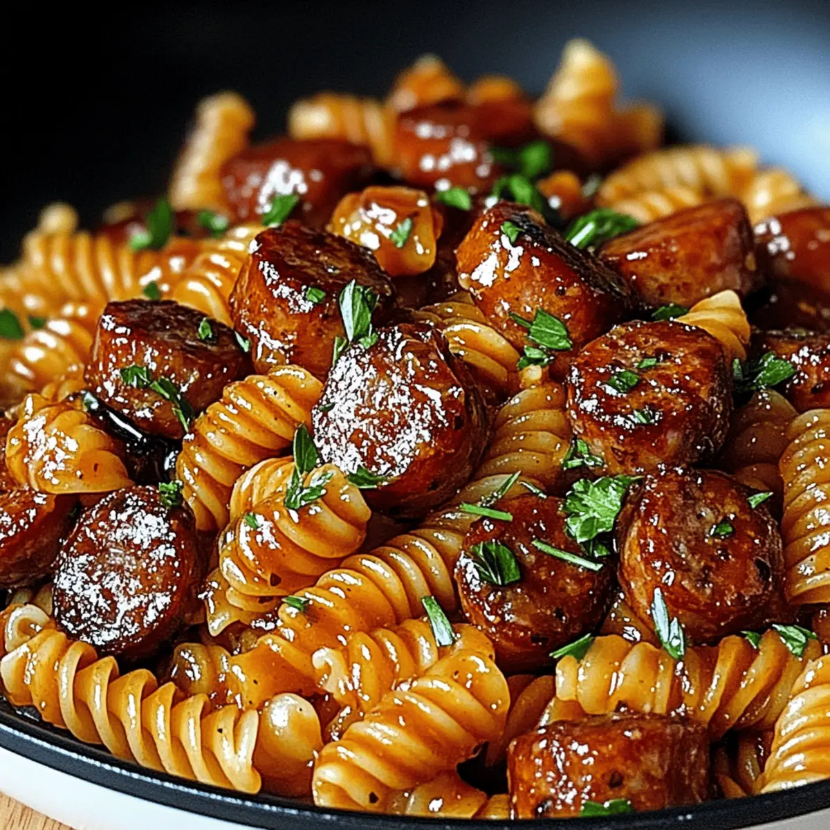 After the sauce has simmered, return the cooked sausage to the skillet along with the drained rotini pasta. Gently toss everything together, ensuring that the pasta and sausage are evenly coated with the rich, sweet-and-spicy honey BBQ sauce. This delightful mix should heat through for another 2-3 minutes, allowing the flavors to meld beautifully.