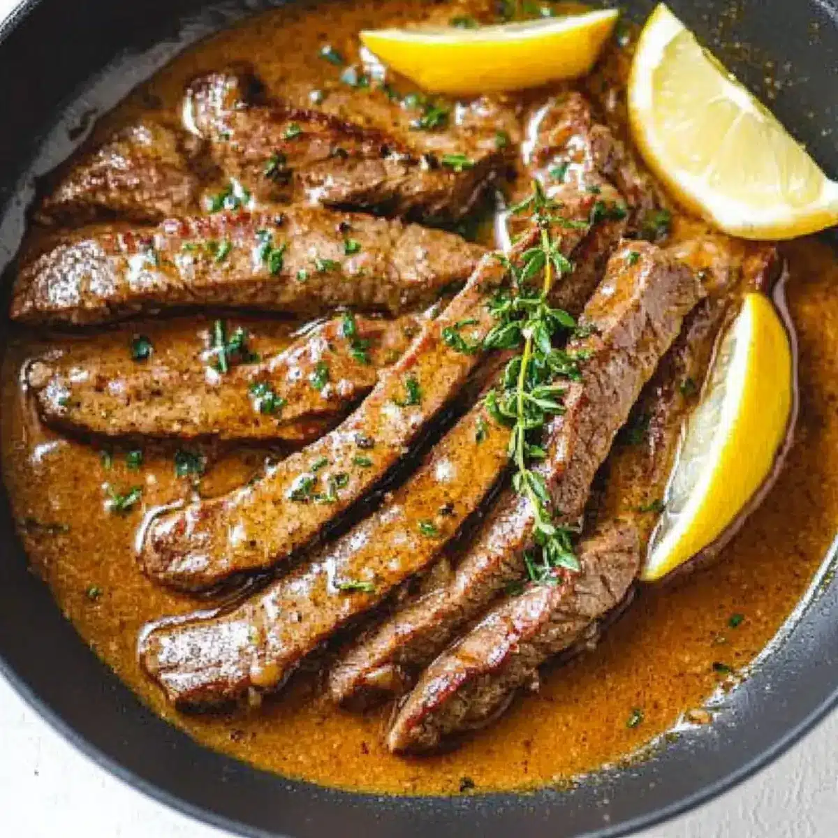 - Prepare Sauce: Reduce skillet heat, add more butter if necessary. Sauté shallot and garlic until fragrant. Stir in thyme, lemon juice, mustard, and beef stock, scraping browned bits from the skillet.