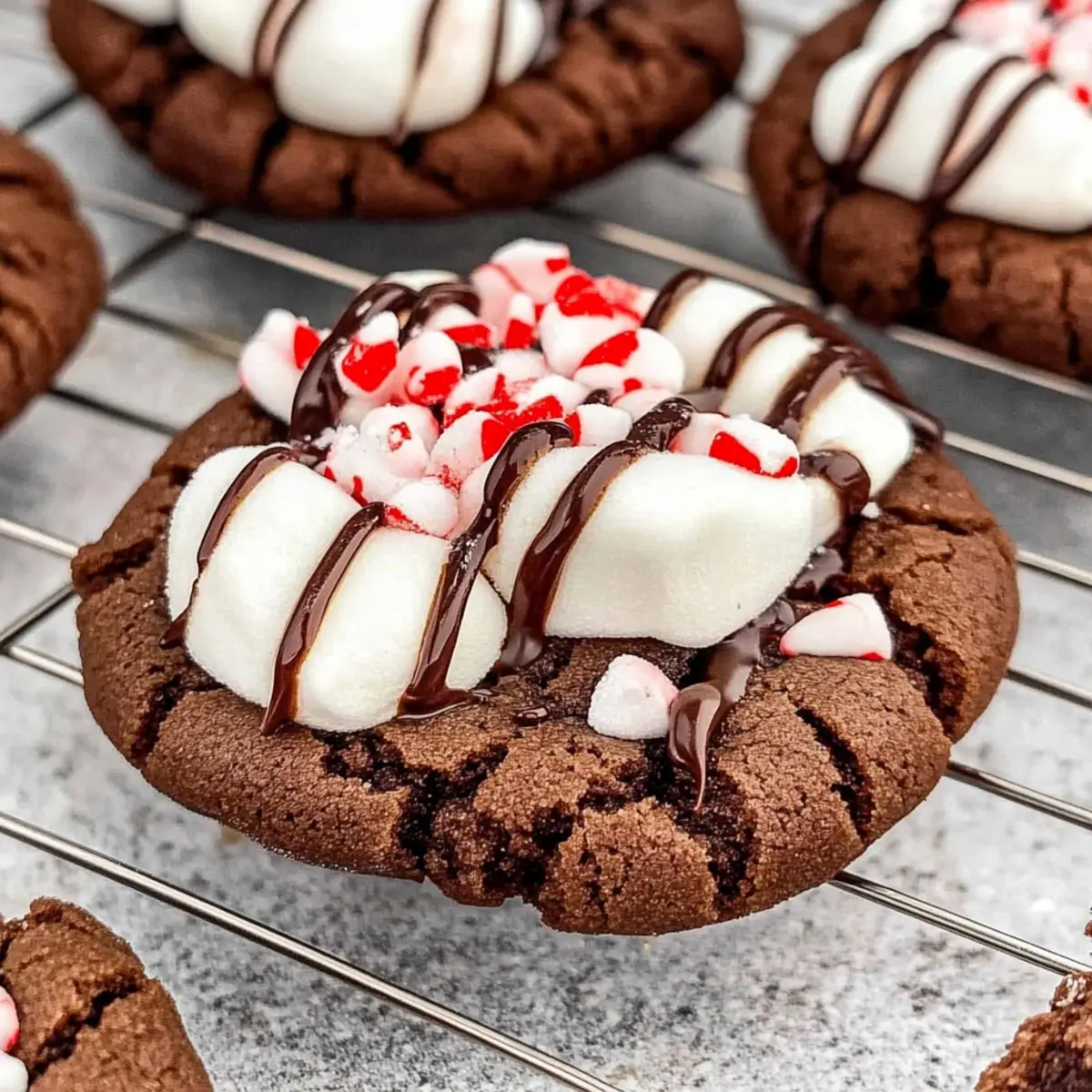 Transfer the freshly baked Peppermint Hot Chocolate Cookies to a wire rack to cool slightly. Once cooled, drizzle melted chocolate over the top and generously sprinkle crushed peppermint candy for a festive finishing touch that will wow your guests and family alike.