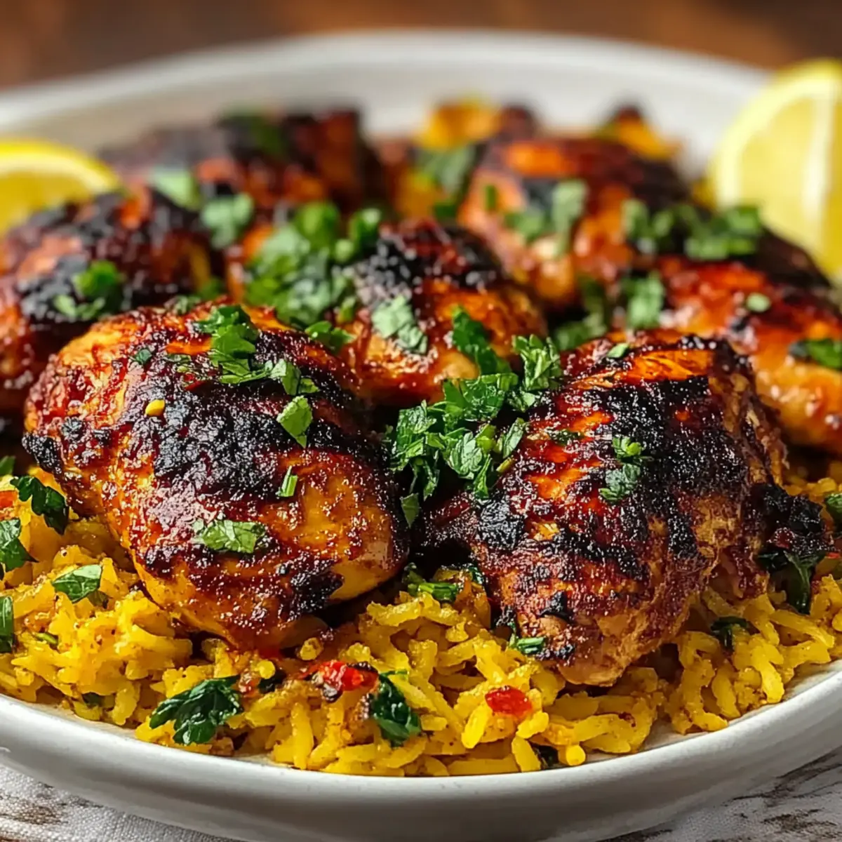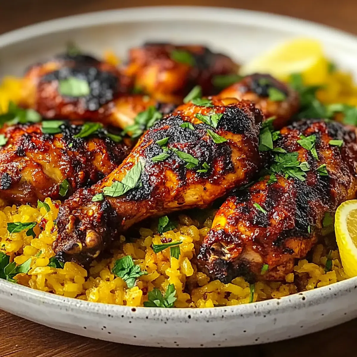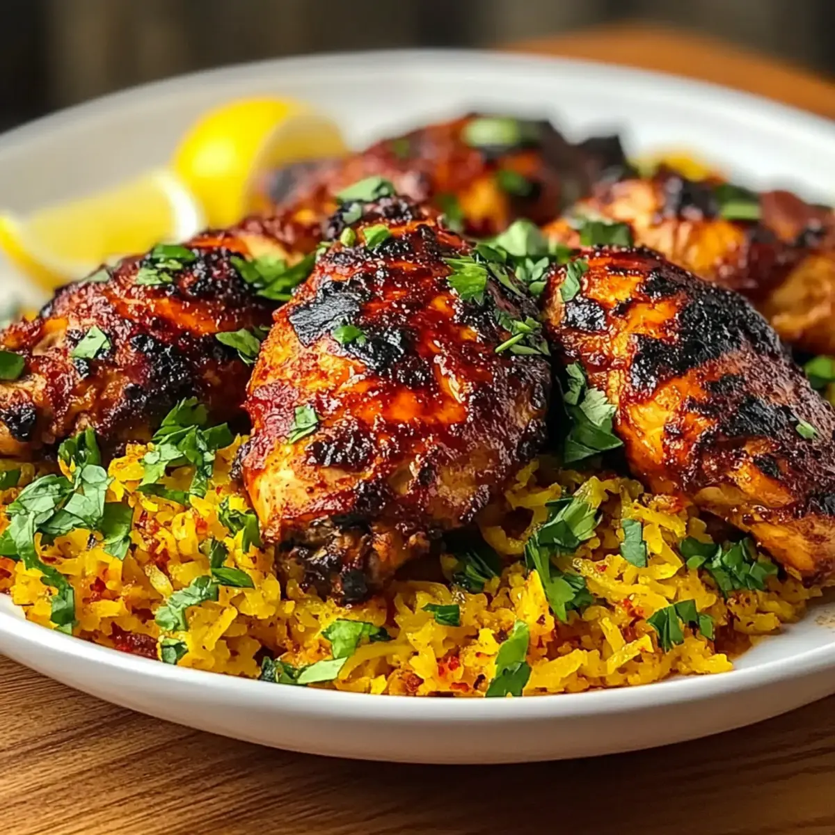 Remove the marinated chicken from the refrigerator and let it sit at room temperature for about 10 minutes. Place the chicken onto the preheated grill or into the oven, cooking for 30–40 minutes, turning occasionally. The chicken is ready when it’s beautifully charred and reaches an internal temperature of 165°F, ensuring it’s juicy and safe to eat.