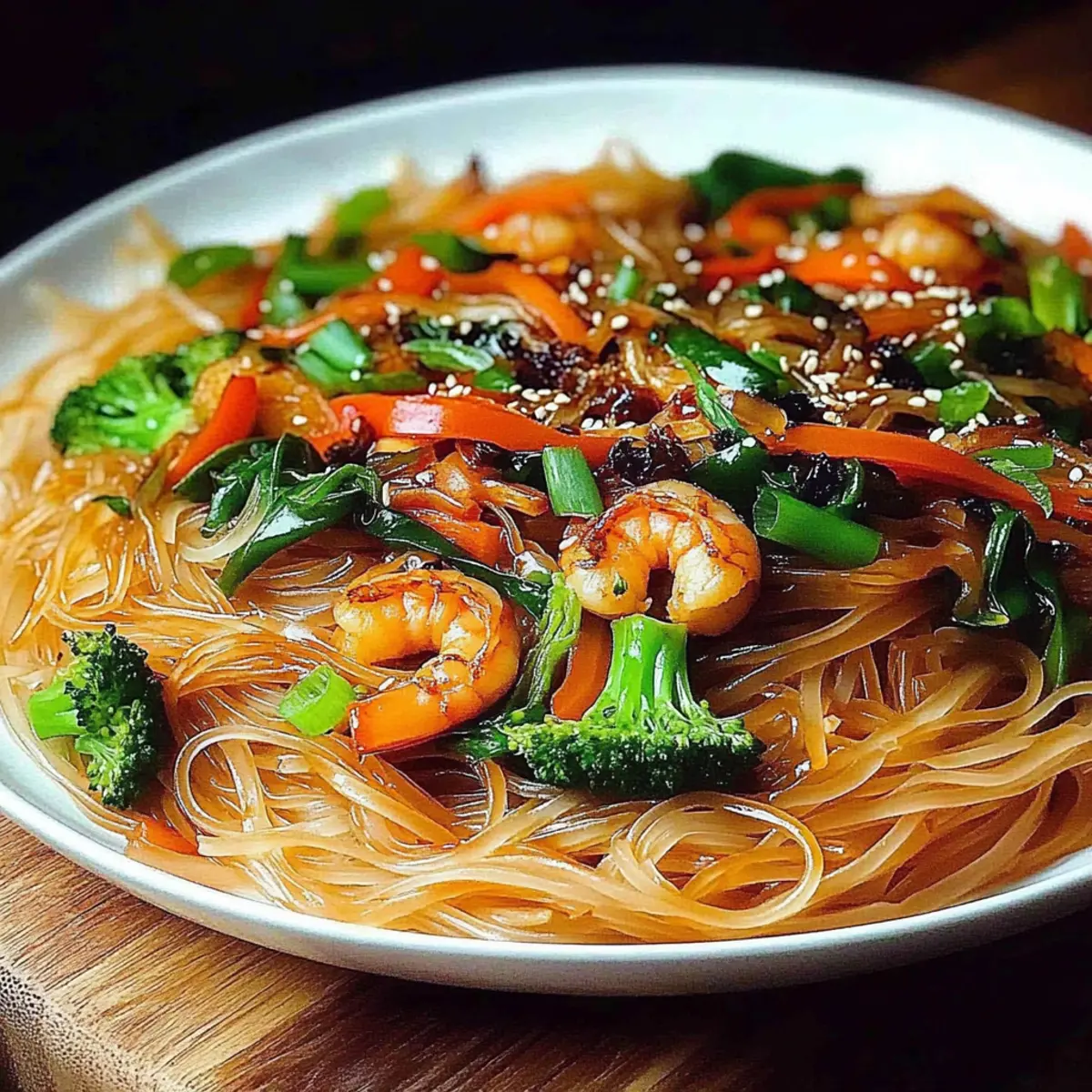 Once everything is well combined, drizzle a touch of sesame oil over the stir-fry for added depth of flavor. Toss again to incorporate the oil, then serve immediately. Garnish with optional sesame seeds and sliced green onions for a fresh finish. Your colorful Rice Noodle Stir-Fry is now ready to be enjoyed, bringing warmth and satisfaction to your dinner table.