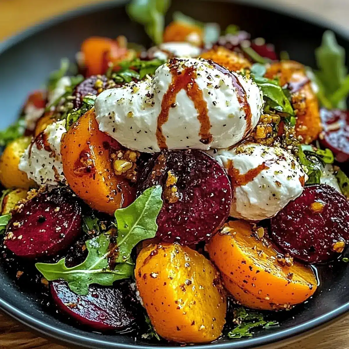 Vibrant Colors: This Roasted Beets and Carrots Salad with Burrata is a feast for the eyes, showcasing an array of vibrant hues that make any table pop.