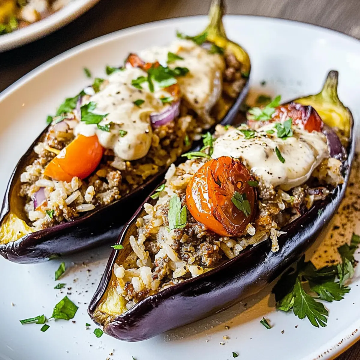 Absolutely! For a vegetarian version, you can substitute the ground meat with cooked lentils, mushrooms, or even a mix of vegetables like zucchini or bell peppers. This makes the stuffed eggplant both hearty and nutritious while keeping the dish vibrant and flavorful.