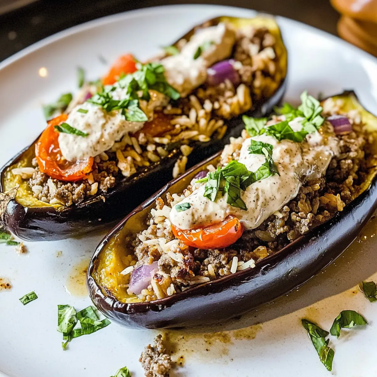 - Drizzle tahini sauce over the stuffed eggplants and bake for an additional 10 minutes.