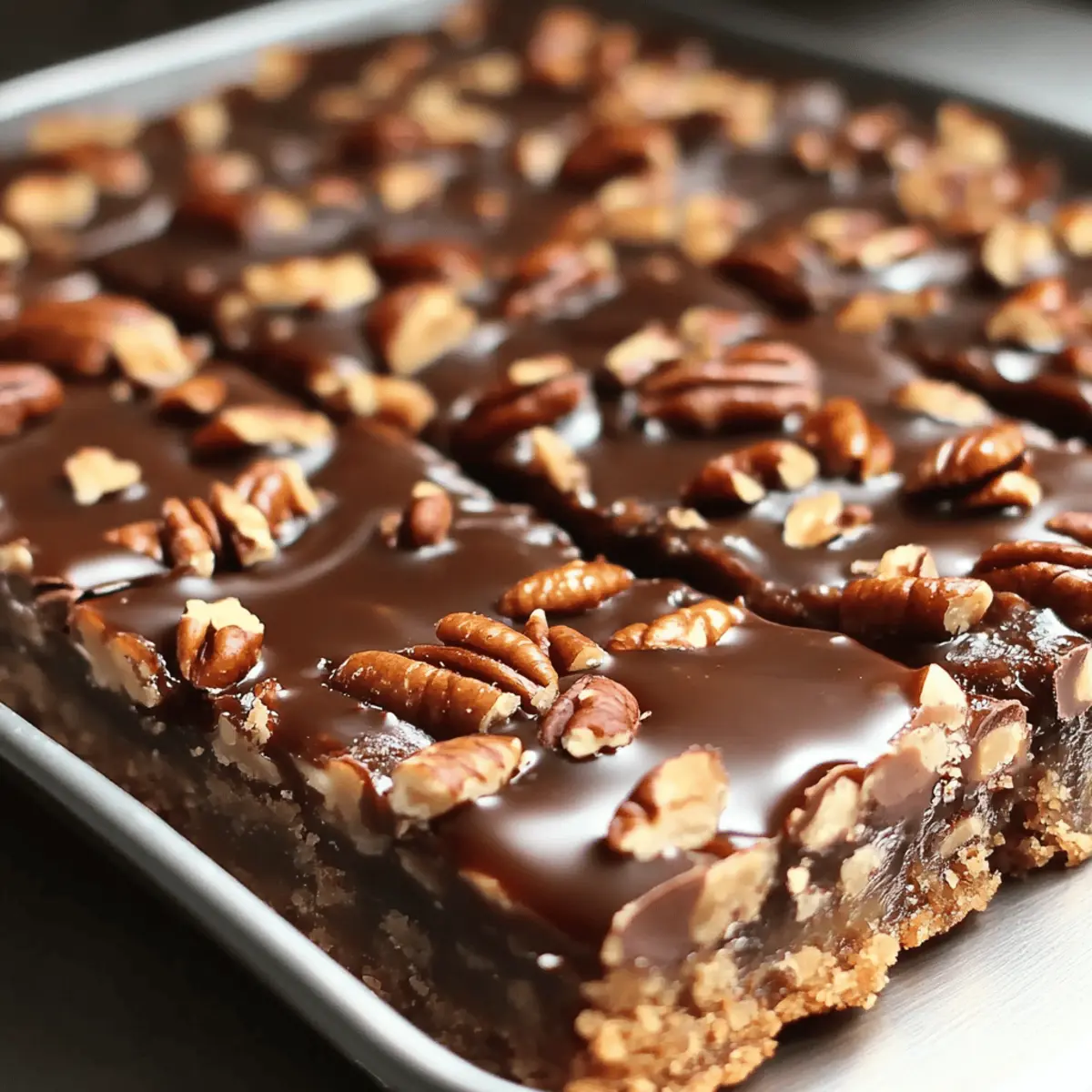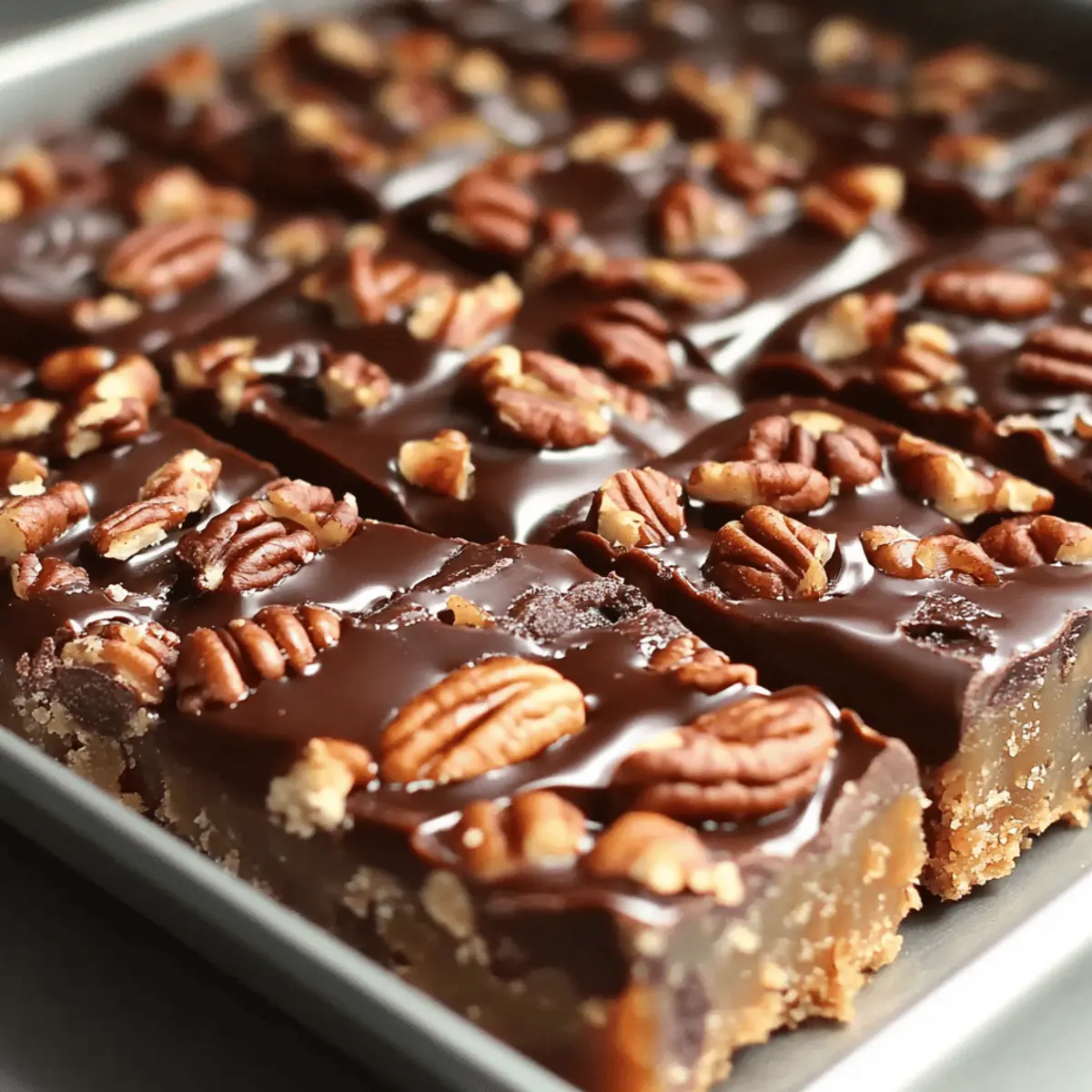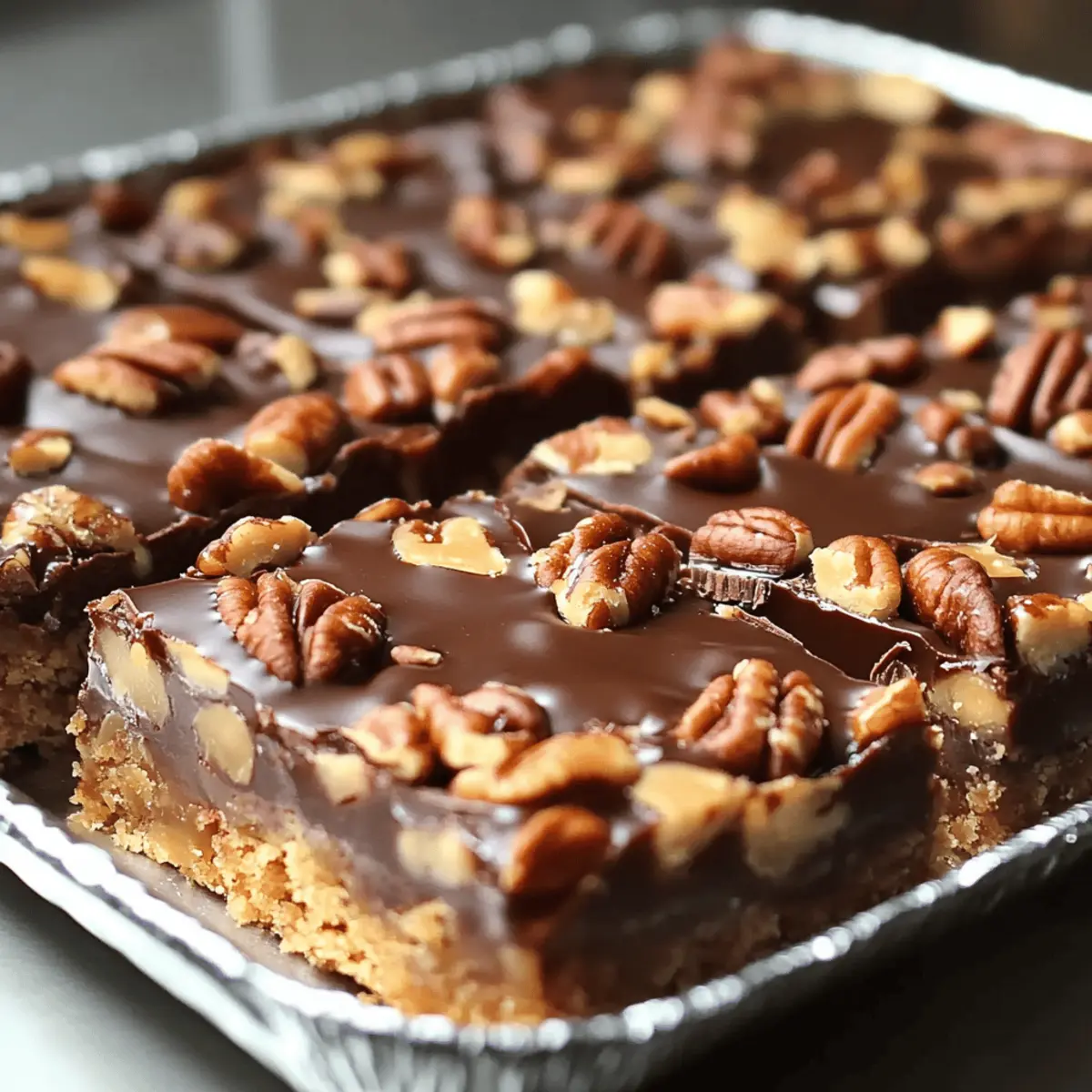 - In a microwave-safe bowl, melt the chocolate chips in 30-second increments until smooth. Pour the melted chocolate over the caramel-pecan layer and spread evenly.
