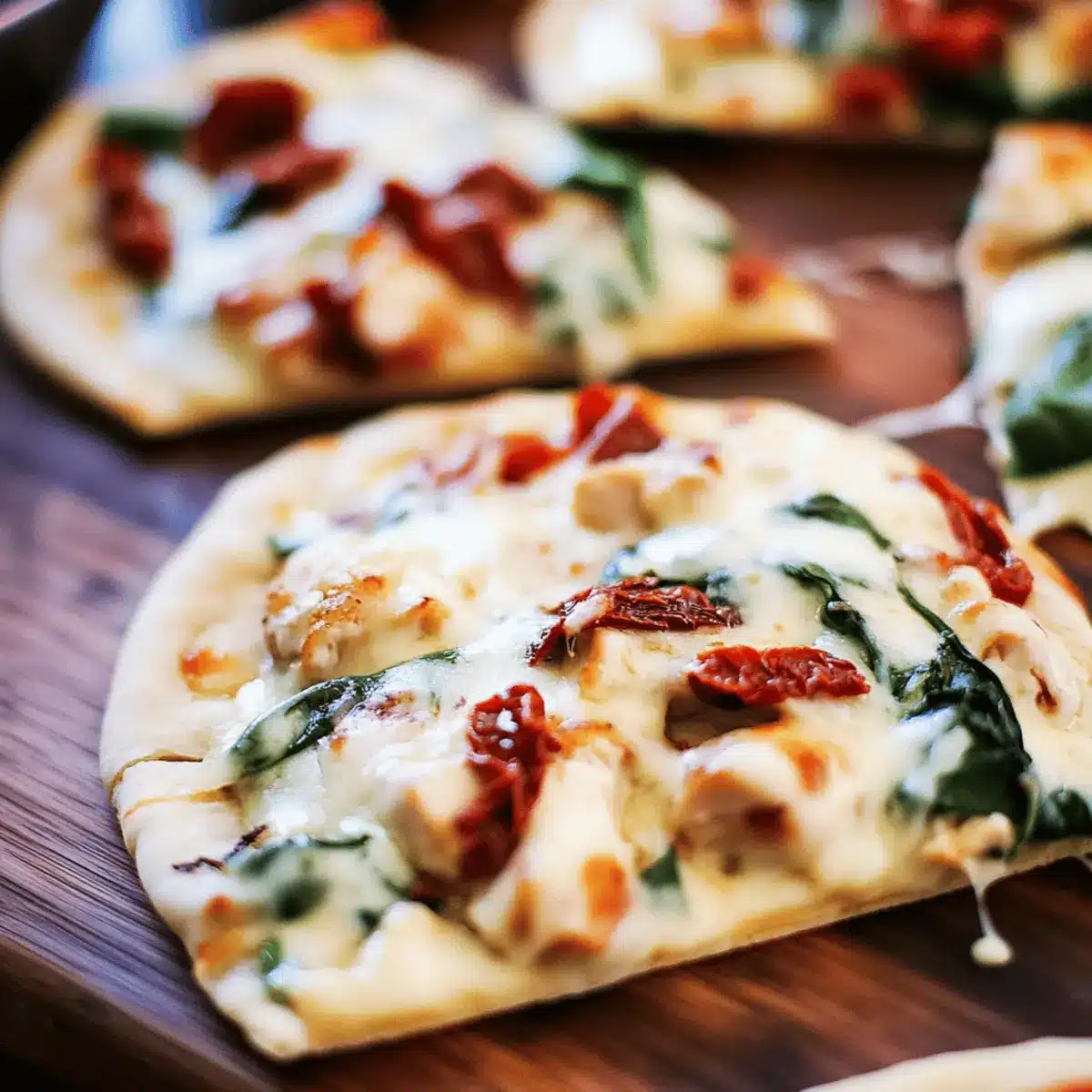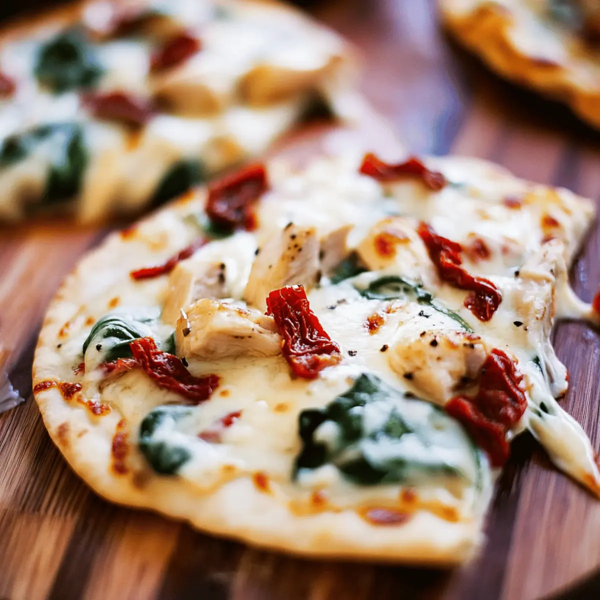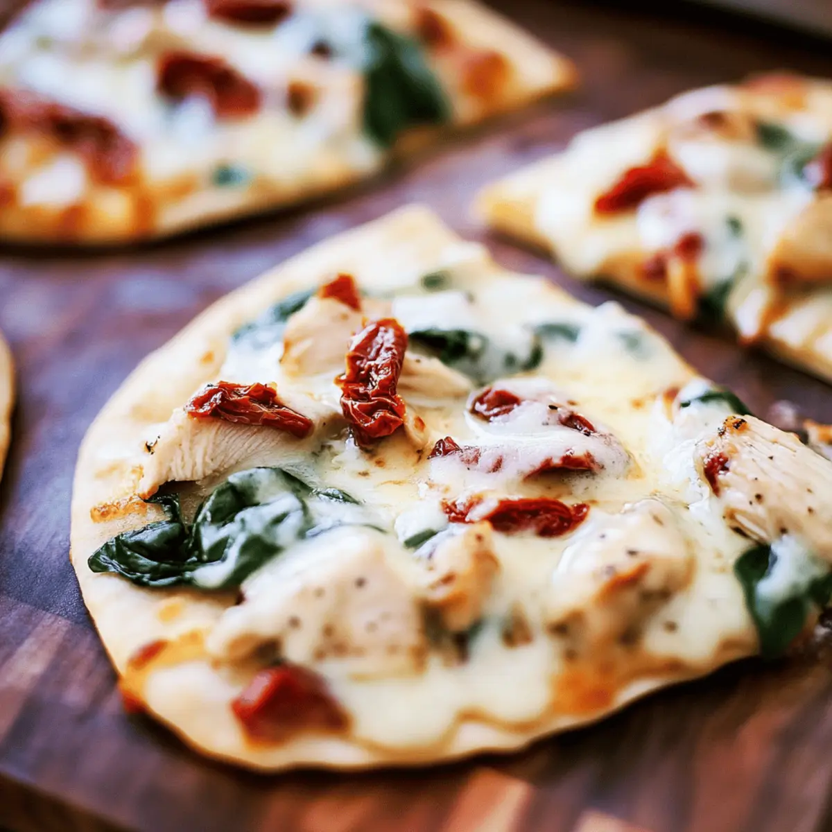 - Spread 3 tablespoons of the creamy Alfredo sauce over each pita bread, then layer with cooked chicken, sun-dried tomatoes, torn spinach, and top with shredded mozzarella.