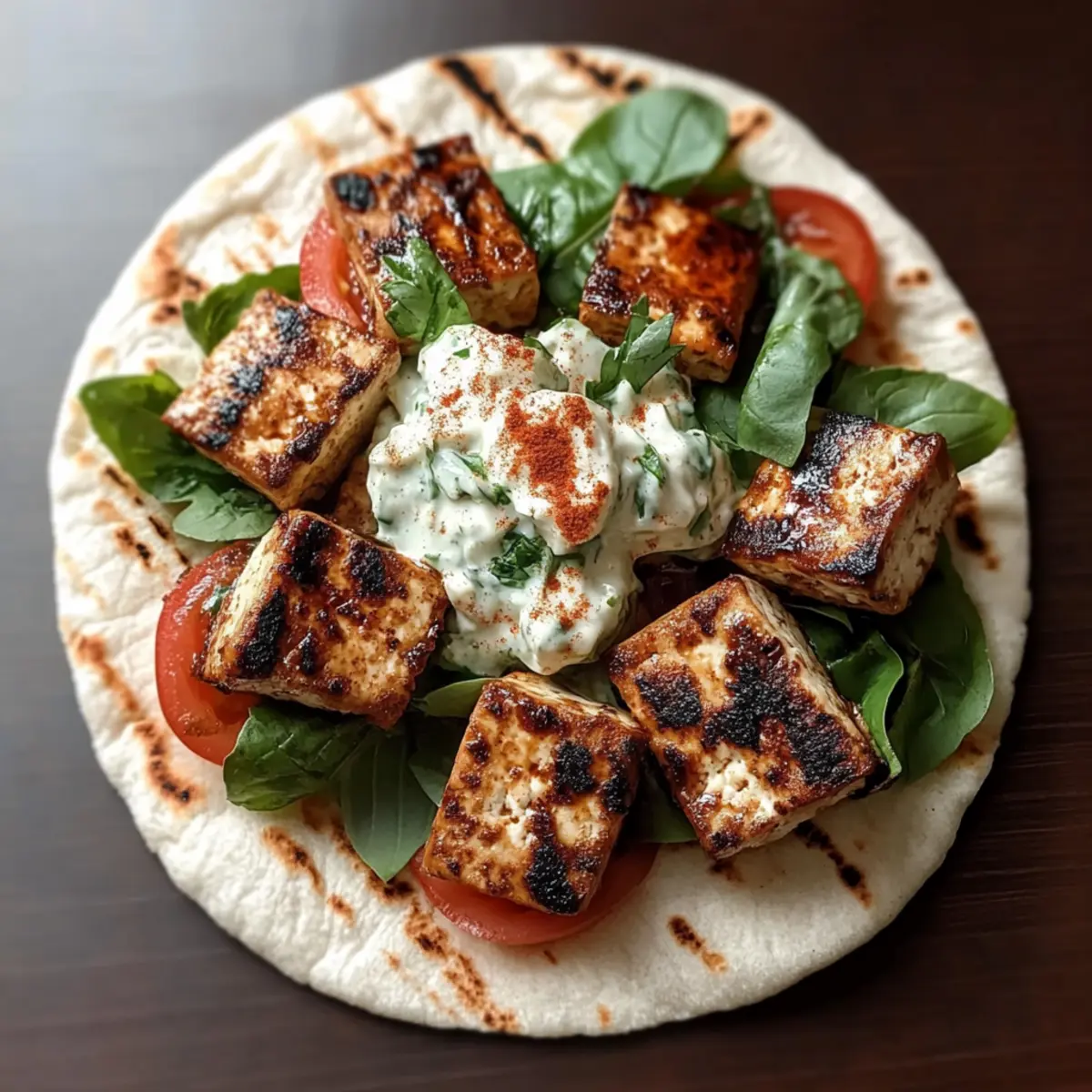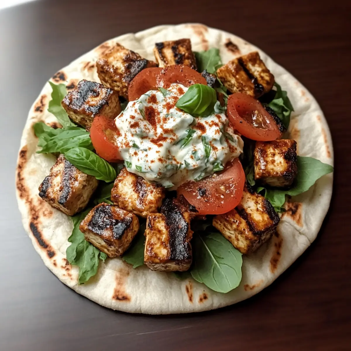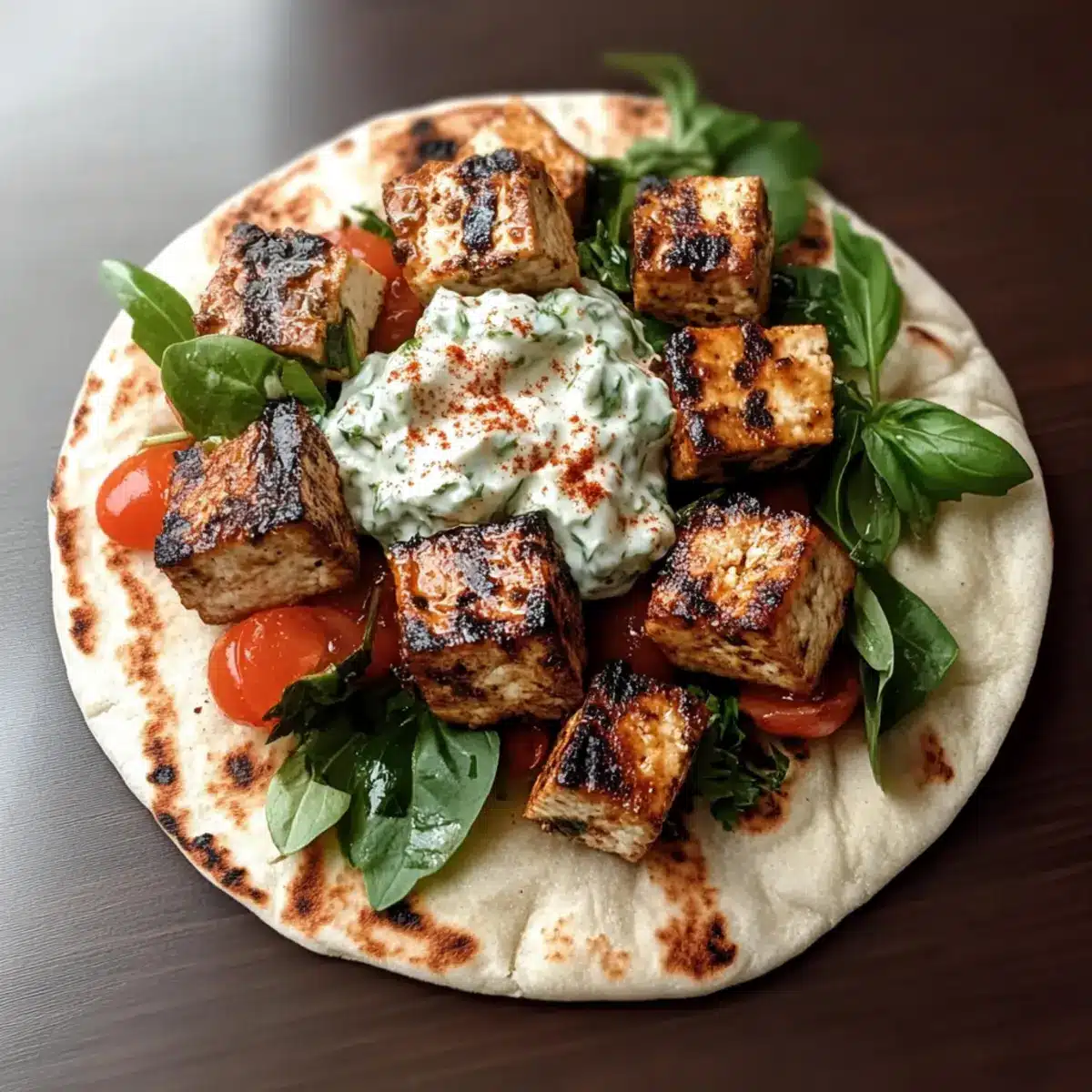 Warm the pita bread slightly in a dry pan or microwave, then lay the crispy tofu skewers on top. Generously add creamy vegan tzatziki over the tofu, allowing the sauce to enhance the flavors and freshness of each bite. Optionally, add fresh veggies or herbs for a colorful presentation and extra crunch, then fold and enjoy your vibrant meal!